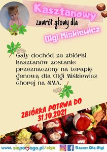Szanowni Państwo Ruszamy z kolejną akcją dla Olgi Miśkiewicz chorej na SMA "Kasztanowy zawrót głowy". Zbieramy kasztany, później je sprzedamy, a za kilogram kasztanów Oldzia otrzyma 0,70 zł. Akcja trwa do końca października lub do wyczerpania kasztanów. Bardzo gorąco...