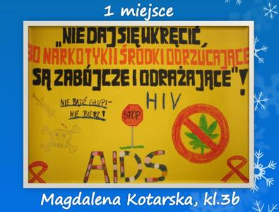 W związku z obchodzonym 1 grudnia Światowym Dniem AIDS zorganizowany został przez szkolnego pedagoga – panią Danutę Grembowską, KONKURS PROFILAKTYCZNY NA WYKONANIE PLAKATU I ULOTKI INFORMACYJNEJ pod hasłem: „NIE DAJ SIĘ WKRĘCIĆ, BO NARKOTYKI I ŚRODKI ODURZAJĄCE SĄ ZABÓJCZE...