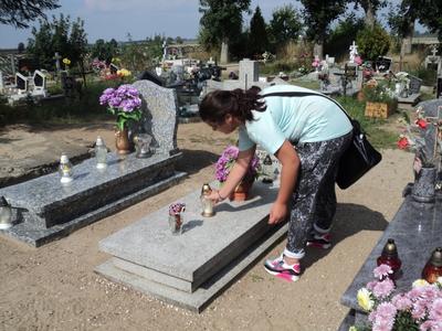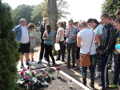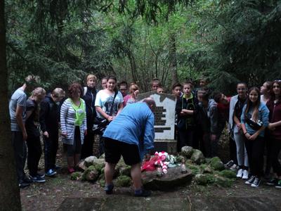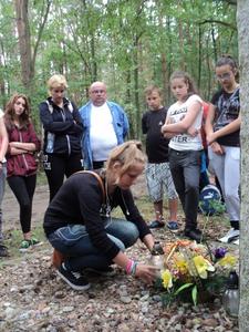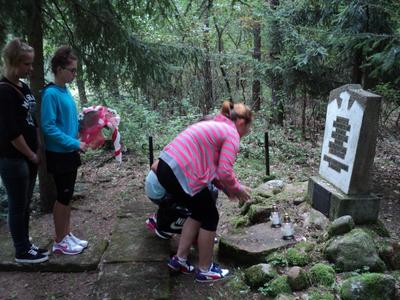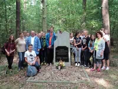 Kolejnym celem wyjazdu było odwiedzenie miejsca, gdzie ukryty w nowaszyckich lasach obelisk z pamiątkową tablicą przypomina o wojennej tragedii, metodycznie mordowanych przez hitlerowskiego okupanta, pacjentów gnieźnieńskiej „Dziekanki”. To tutaj – z dużym prawdopodobieństwem, na co wskazuje wiele faktów – zostało zabitych wielu z nich. Po uczczeniu ich pamięci przedstawiciele naszej szkolnej społeczności pojechali leśnymi i polnymi drogami na cmentarz do Popowa Ignacewa. Tam, przy grobach bohaterów wojennych straconych pod Mielnem, pomodlili się o spokój ich dusz i zapanowanie pokoju na świecie.