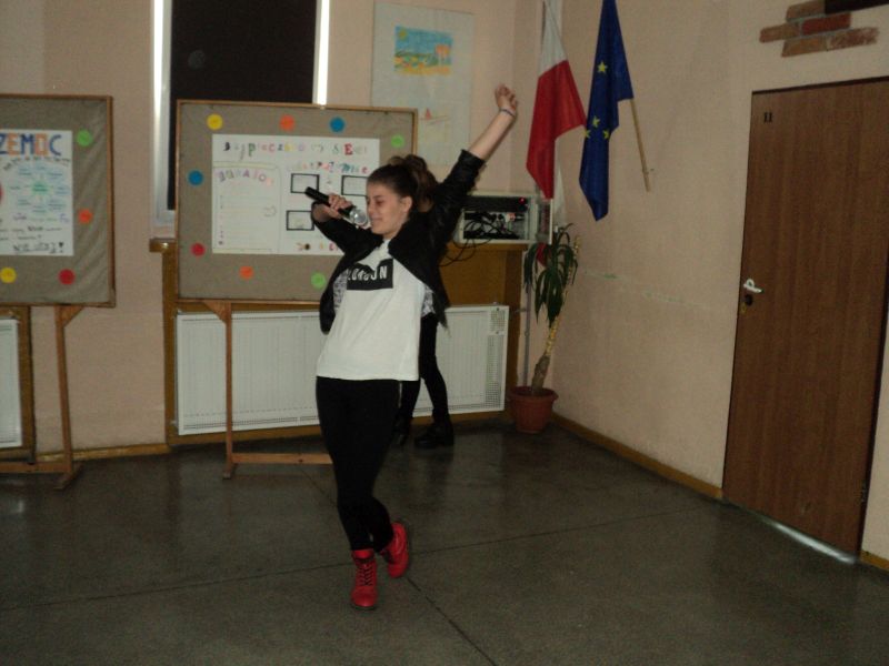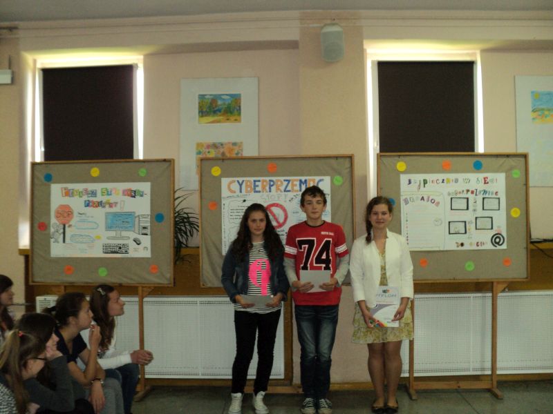 Po nagrodzonym gromkimi brawami występie nastąpił z niecierpliwością oczekiwany finał konkursu profilaktycznego na gazetkę klasową i plakat na temat bezpiecznego korzystania z Internetu pod hasłem: „BĄDŹ BEZPIECZNY W INTERNECIE – STOP CYBERPRZEMOCY!”.