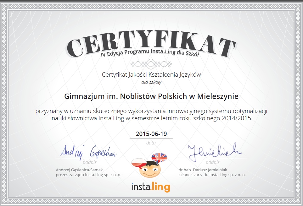 Nauczyciele języków obcych mają przyjemność poinformować, że nasze gimnazjum otrzymało certyfikat potwierdzający wdrożenie innowacyjnego systemu do nauki języka angielskiego. Wierzymy, iż uczniom naszego gimnazjum program ten przypadł go gustu oraz mamy nadzieję na równie owocną współpracę w przyszłym roku szkolnym.
