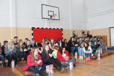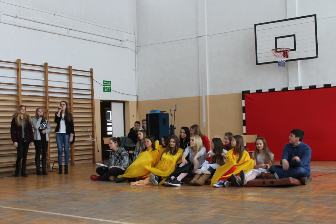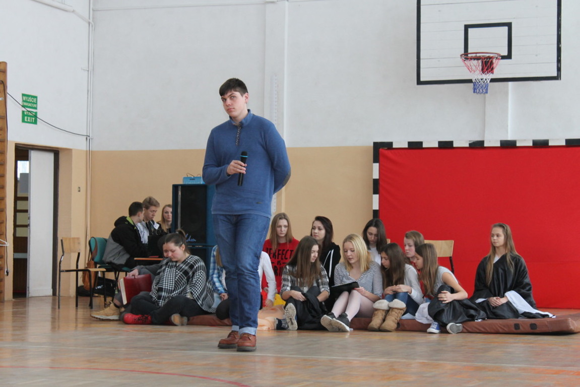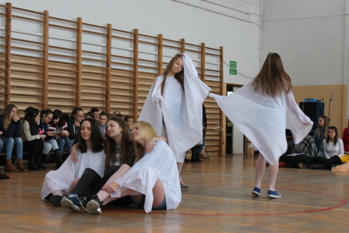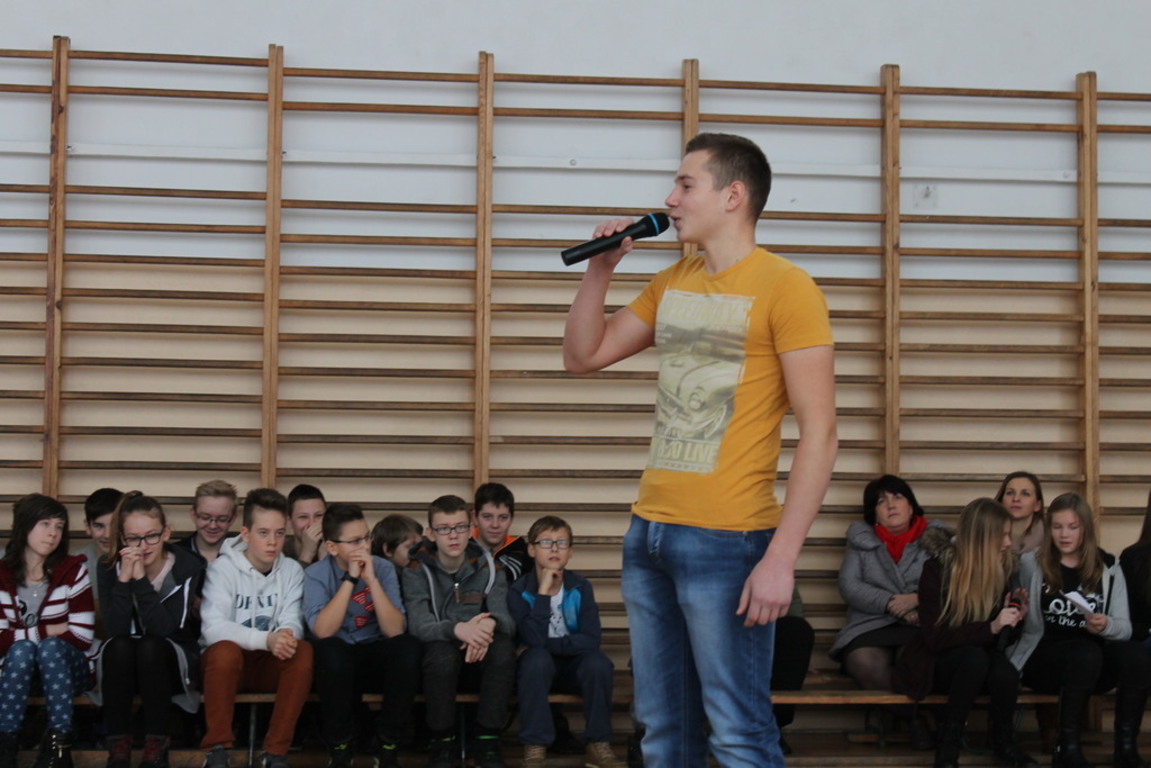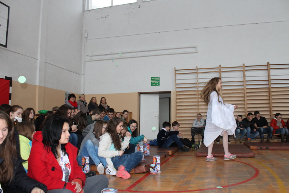 W piątkowe przedpołudnie, 8 stycznia 2016r., gościliśmy w naszej szkole uczniów Gimnazjum im. Adama Borysa w Witkowie, którzy w ramach profilaktyki rówieśniczej zaprezentowali naszej społeczności szkolnej przygotowane na ubiegłoroczne obchody Ogólnopolskiego Głosu Profilaktyki przedstawienie pt.: „Życie nie po to jest, by brać!”. Wraz z dwudziestoosobową grupą witkowskiej młodzieży przyjechały opiekunki, autorki i reżyserki tego wspaniałego, profilaktycznego występu: pani Justyna Jutkowiak – psycholog szkolny oraz pani Elżbieta Drozdowska – nauczycielka muzyki. Cała społeczność naszego Gimnazjum oraz uczniowie klasy VI Szkoły Podstawowej, zebrali się na sali gimnastycznej, gdzie z ogromnym zainteresowaniem obejrzeli ten niosący niezwykle ważne przesłanie hapeeningowy występ.