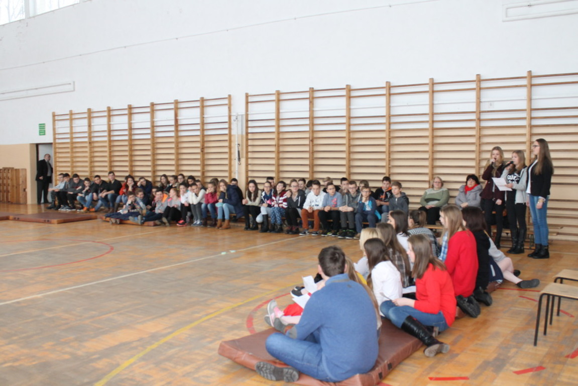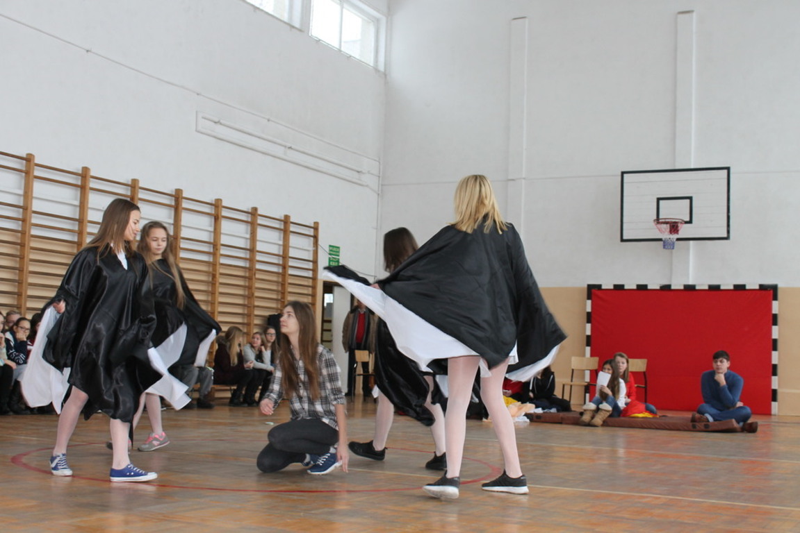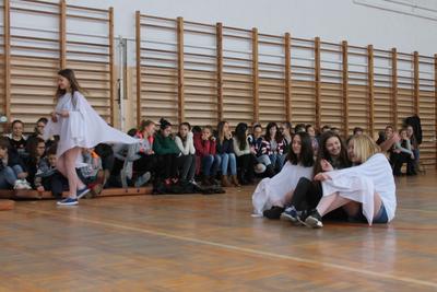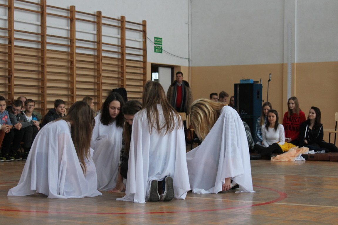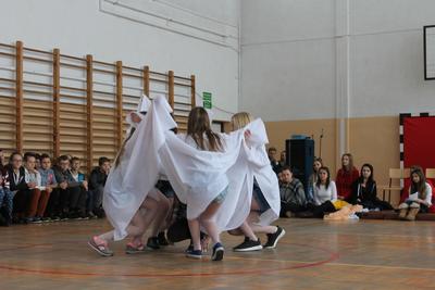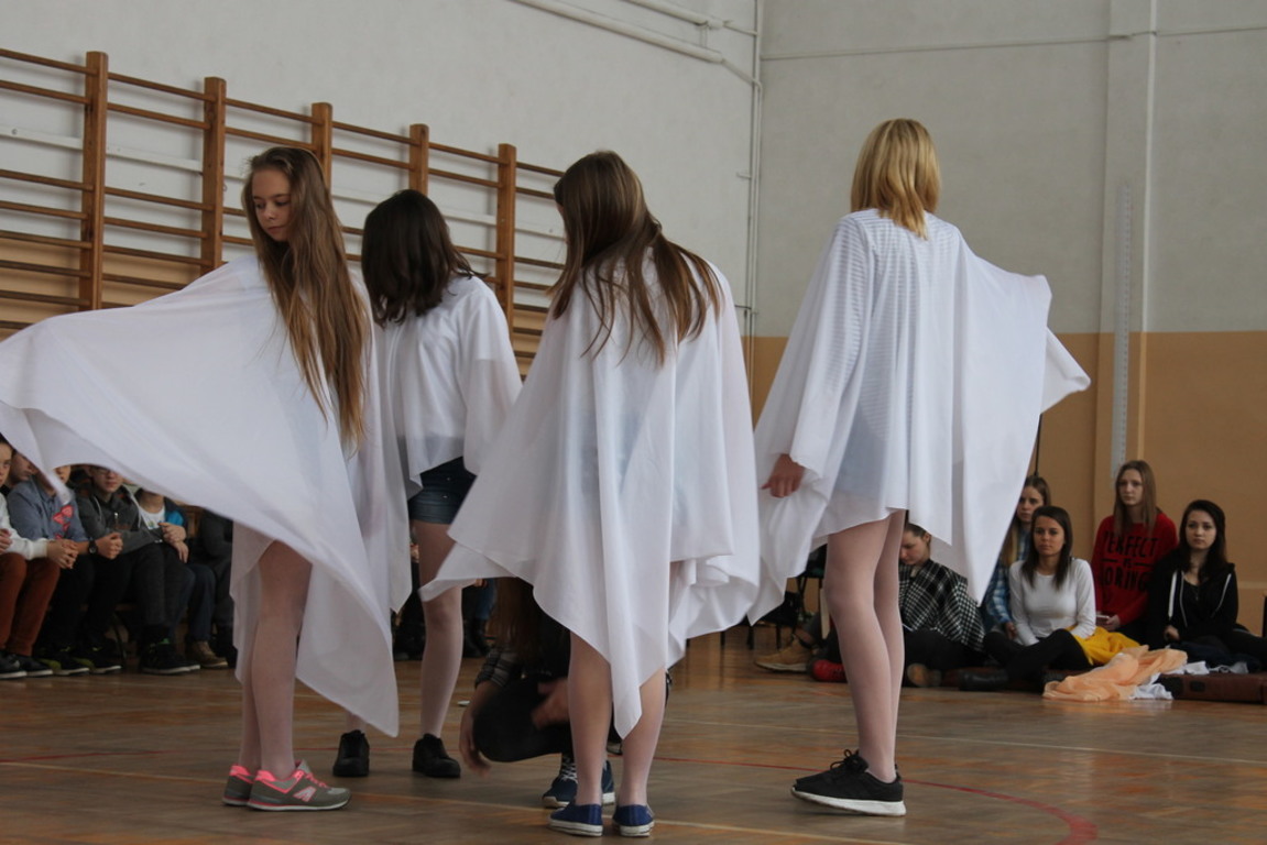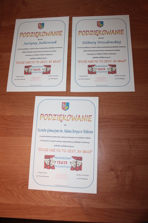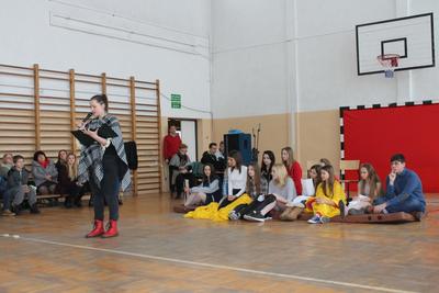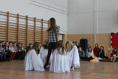 W piątkowe przedpołudnie, 8 stycznia 2016r., gościliśmy w naszej szkole uczniów Gimnazjum im. Adama Borysa w Witkowie, którzy w ramach profilaktyki rówieśniczej zaprezentowali naszej społeczności szkolnej przygotowane na ubiegłoroczne obchody Ogólnopolskiego Głosu Profilaktyki przedstawienie pt.: „Życie nie po to jest, by brać!”. Wraz z dwudziestoosobową grupą witkowskiej młodzieży przyjechały opiekunki, autorki i reżyserki tego wspaniałego, profilaktycznego występu: pani Justyna Jutkowiak – psycholog szkolny oraz pani Elżbieta Drozdowska – nauczycielka muzyki. Cała społeczność naszego Gimnazjum oraz uczniowie klasy VI Szkoły Podstawowej, zebrali się na sali gimnastycznej, gdzie z ogromnym zainteresowaniem obejrzeli ten niosący niezwykle ważne przesłanie hapeeningowy występ.