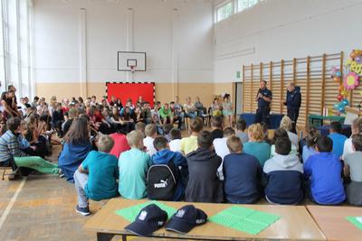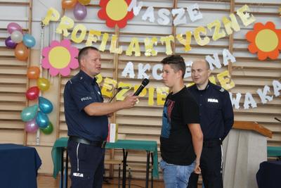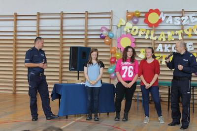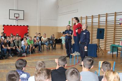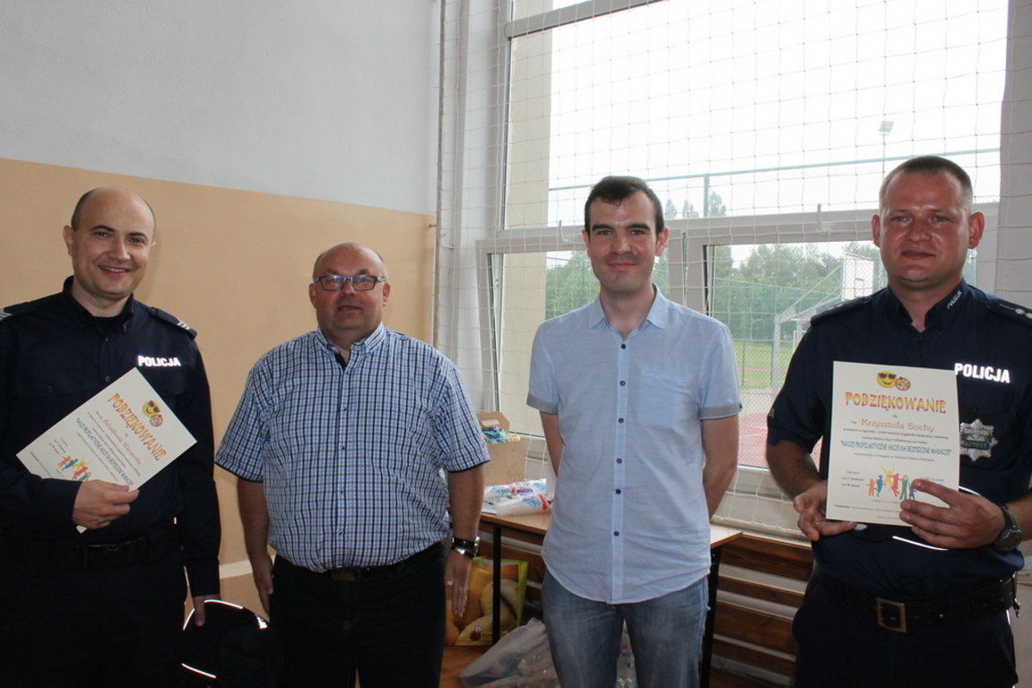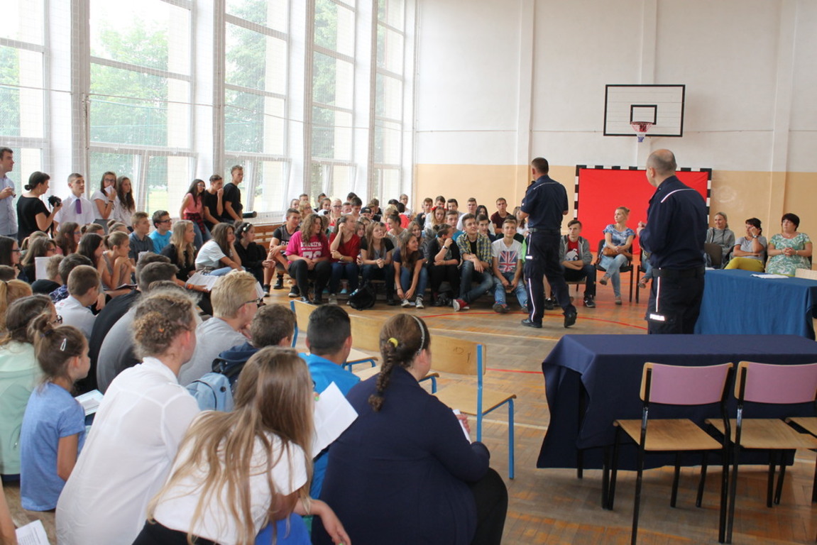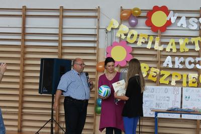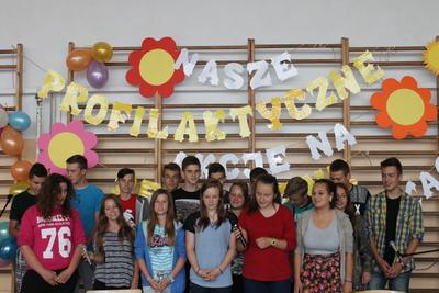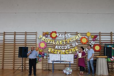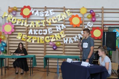 Podczas części finałowej w dniu 20 czerwca 2016r. na sali gimnastycznej, po powitaniu przez Dyrektora – p. Piotra Matysiaka, odbyło się spotkanie z przedstawicielami Policji na temat bezpiecznych wakacji młodzieży szkolnej. Pogadankę na temat niebezpiecznych używek – dopalaczy, narkotyków, alkoholu przeprowadzili specjaliści ds. profilaktyki sierż szt. Arkadiusz Wieczorek - profilaktyk społeczny z Komendy Powiatowej Policji w Gnieźnie oraz asp. Krzysztof Socha zajmujący się sprawami profilaktyki dotyczącej dopalaczy-narkotyków. Następnie uczniowie zaprezentowali przygotowane profilaktyczne scenki i piosenki poruszające temat niebezpiecznych dla zdrowia i życia używek – narkotyków, alkoholu i tytoniu: