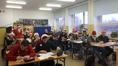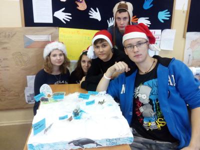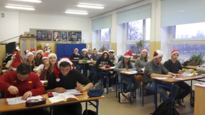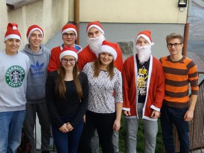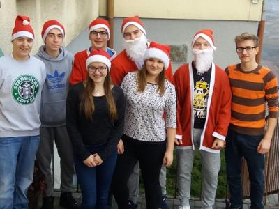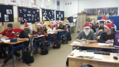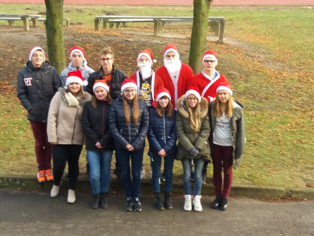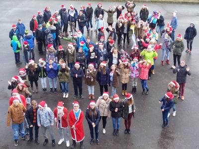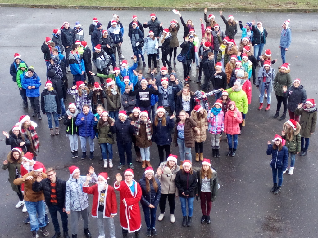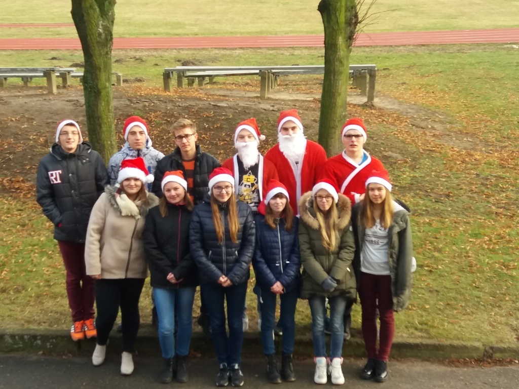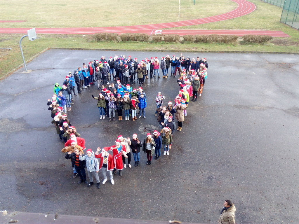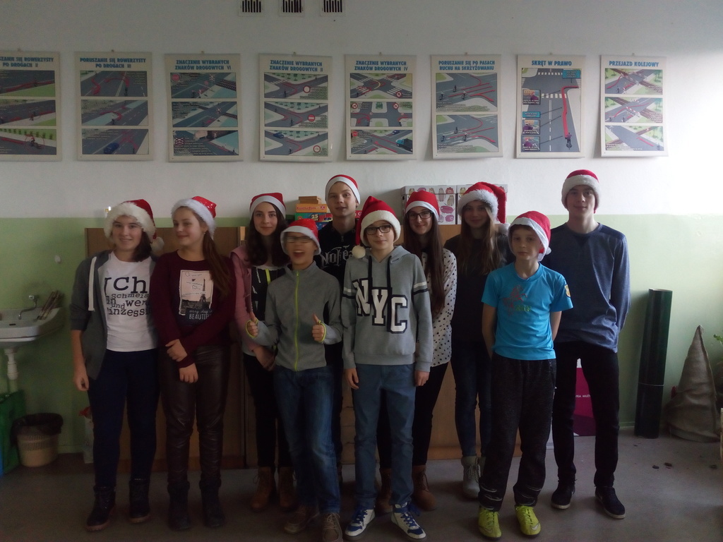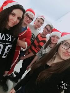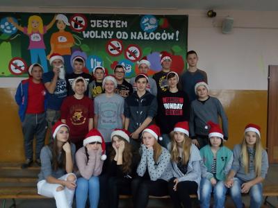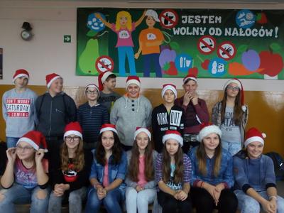 Mikołajki w naszym gimnazjum spędziliśmy w szczególny sposób. Samorząd szkolny zorganizował akcję, która polegała na tym, że uczniowie, którzy będą mieli czerwoną czapką, zostaną zwolnieni z odpowiedzi. Wszystkim bardzo spodobał się ten pomysł. Na szkolnych korytarzach górował świąteczny kolor. Przez cały czas panowała miła, świąteczna atmosfera. Na koniec dnia uczniowie wraz z nauczycielami wyszli na boisko szkolne i ustawili się w kształcie serca. Mieliśmy oczywiście czapki Mikołajów. Uwieczniliśmy tę chwilę na zdjęciu.