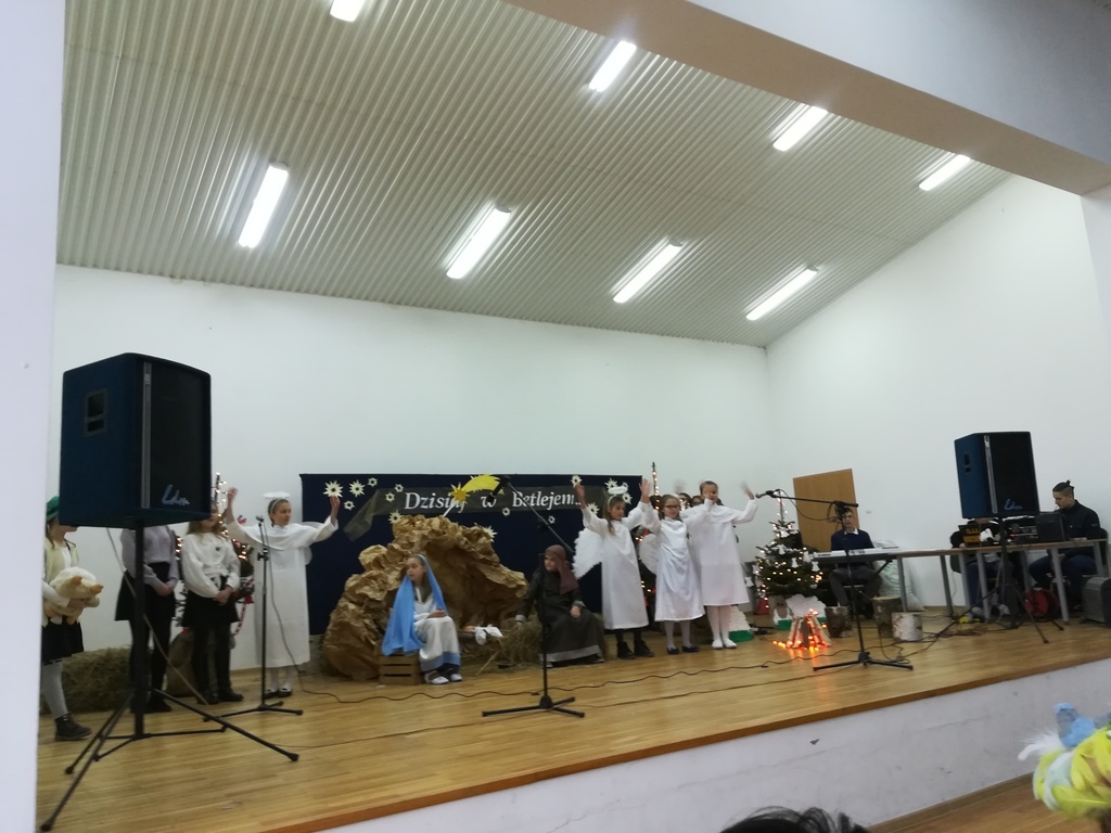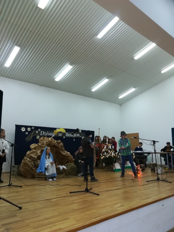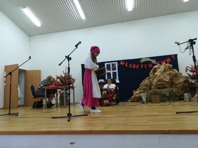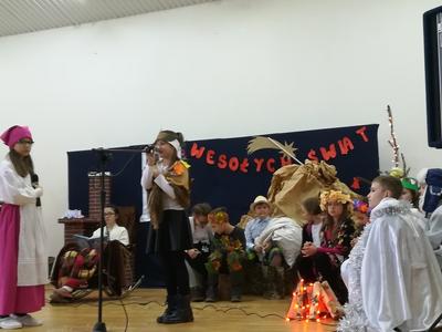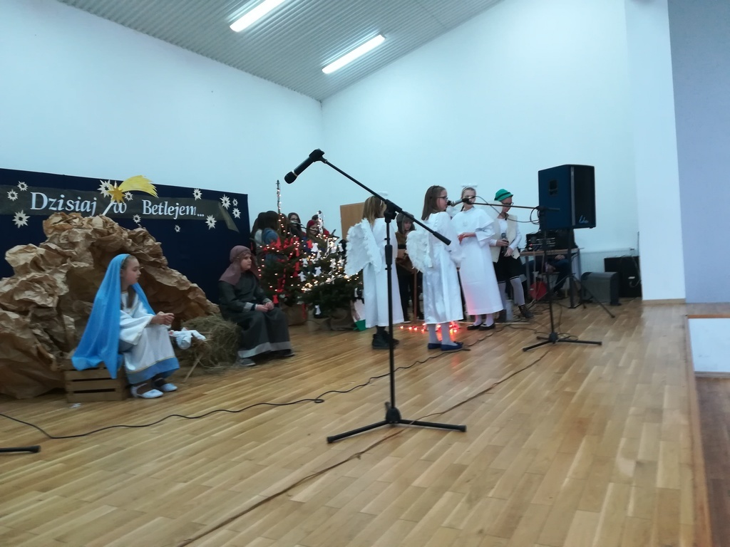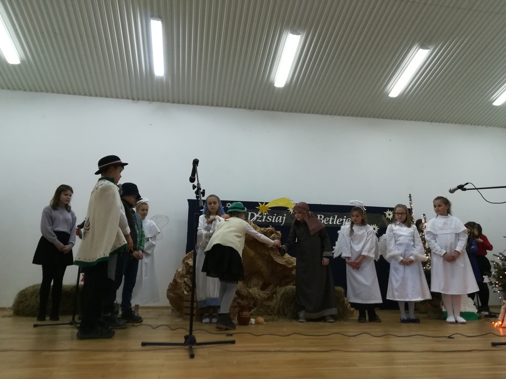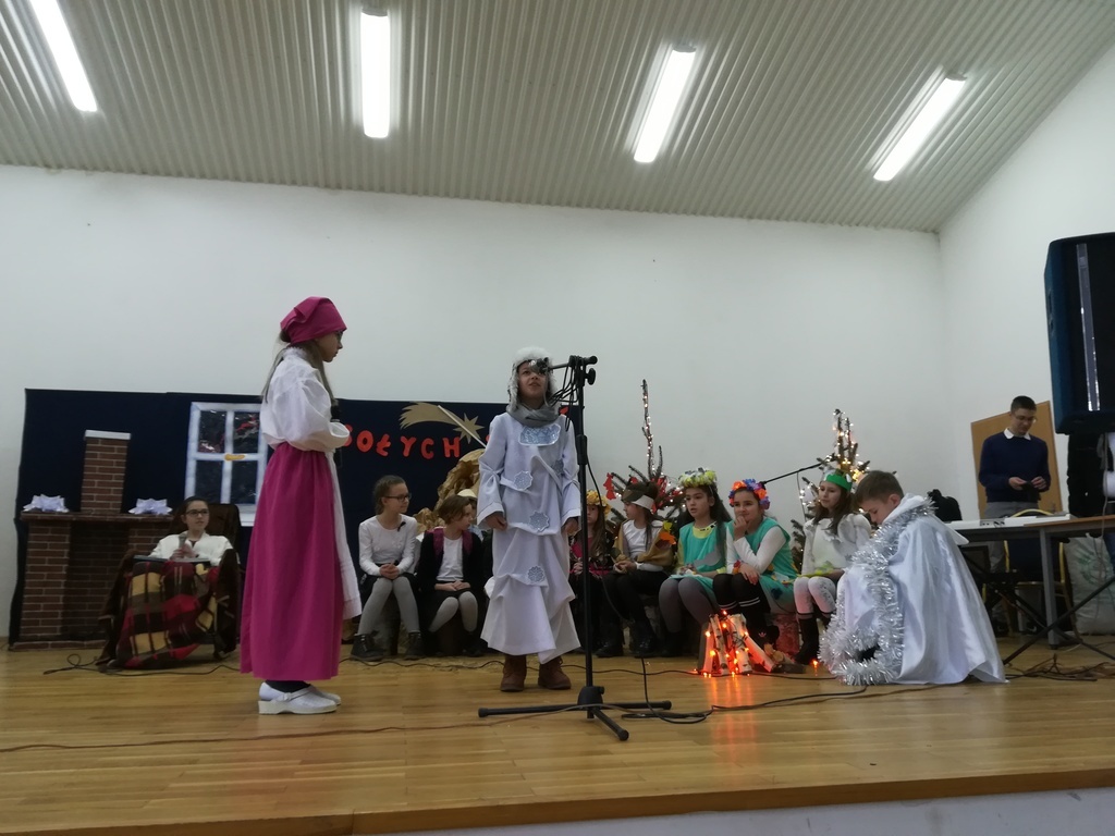 Klasa 4 B w przedstawieniu jasełkowym przypomniała wydarzenia sprzed ponad dwóch tysięcy lat, kiedy to w Betlejem narodziło się Boże Dzieciątko. Dzieci wcieliły się w role Maryi i Józefa, pasterzy, aniołów, trzech króli, przybywających złożyć pokłon Jezusowi narodzonemu w ubogiej stajence. Uroku inscenizacji dodały kolędy, które napełniły wszystkich świąteczną radością i sprawiły, że poczuliśmy magię zbliżających się świąt. Do wspólnego kolędowania włączyli się uczniowie, nauczyciele, rodzice i zaproszeni goście.