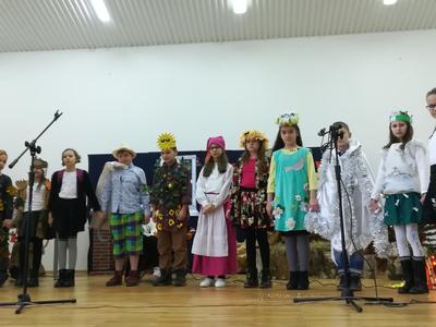 Natomiast uczniowie klasy 4A wcielili się w postaci miesięcy, przedstawiając „Baśń o dwunastu miesiącach”. Morał jaki wypłynął z bajki to: dobre serce i grzeczność przynosi wiele korzyści w życiu a za lenistwo i brak uprzejmości spotyka nas kara.