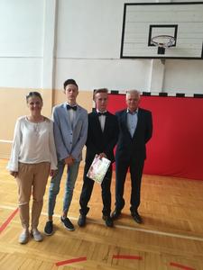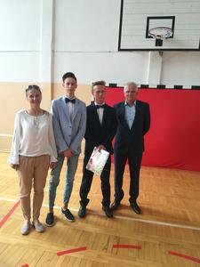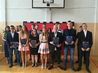 Po krótkim występie trzecioklasistów Pani dyrektor wręczyła świadectwa uczniom, którzy w tym roku szkolnym uzyskali ze swych ocen średnią powyżej 4,75. A najlepszym, wraz z Radnym Gminy Mieleszyn - p. Mariuszem Mikołajczakiem, wręczyła stypendia naukowe i sportowe uczniom, którzy w minionym roku uzyskali wyróżniające się wyniki w nauce bądź sporcie. Następnie młodzież klas drugich pożegnała miłym słowem gimnazjalnych trzecioklasistów.