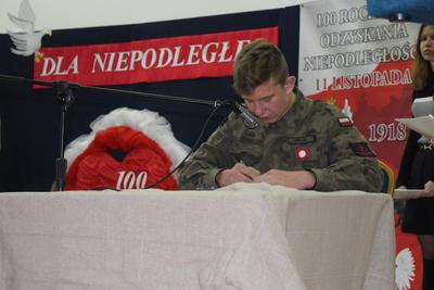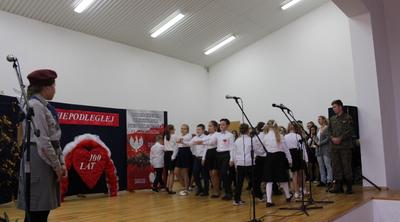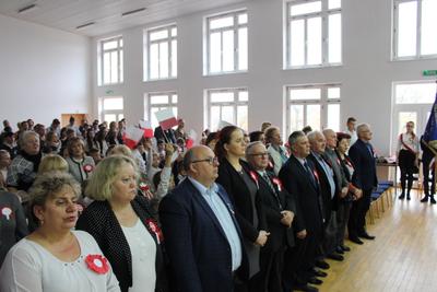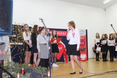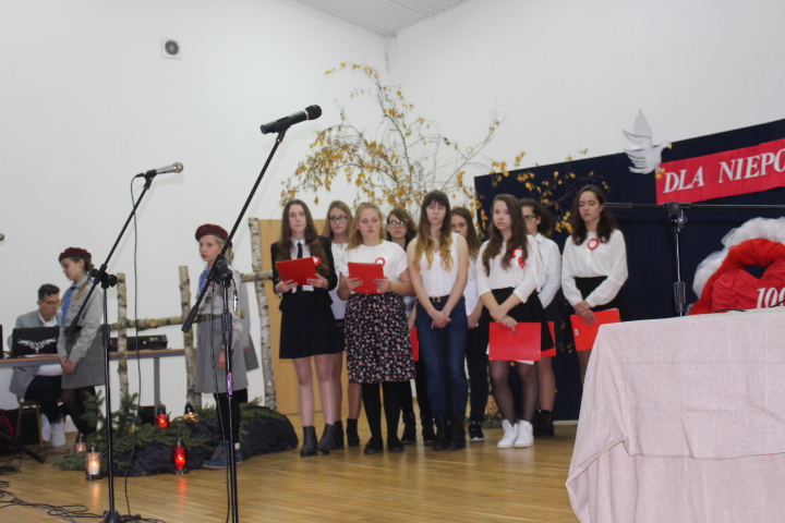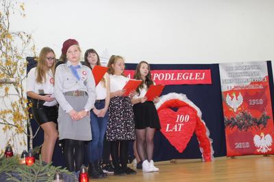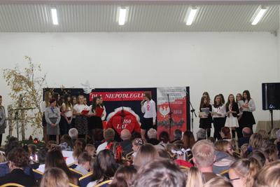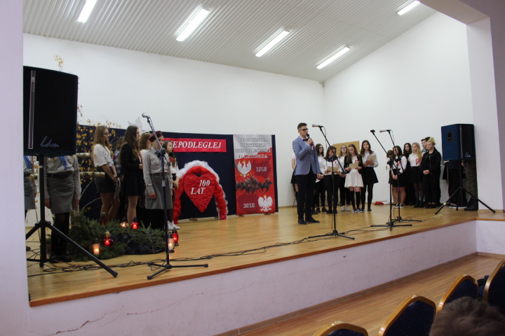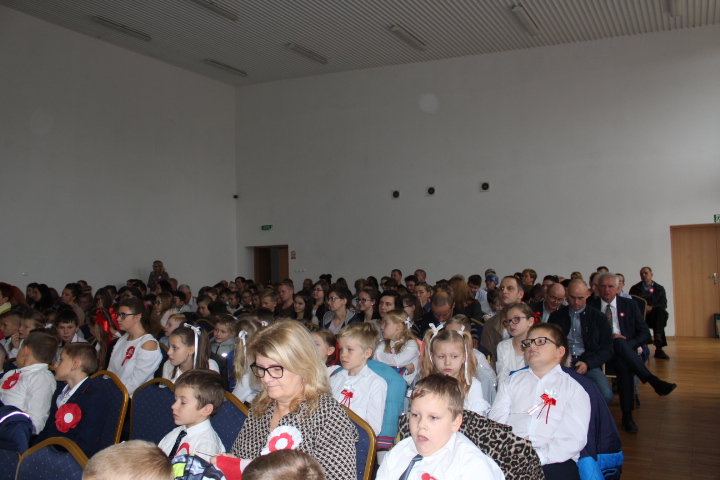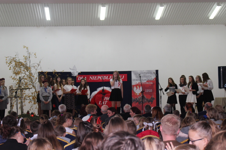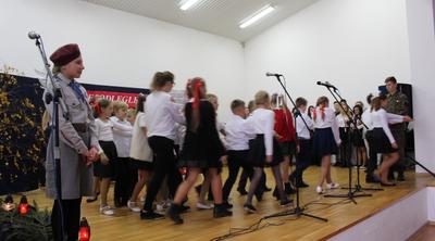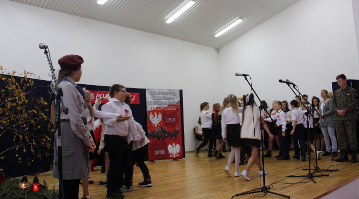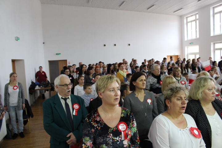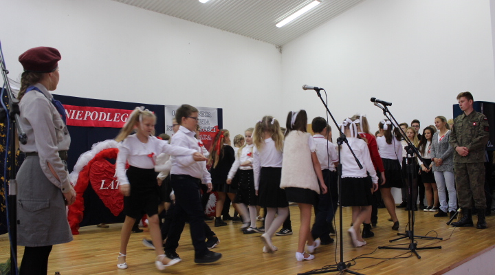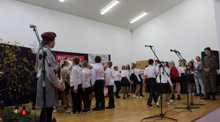 Po uroczystym odśpiewaniu hymnu państwowego głos zabrał Józef Oziębło, który przybliżył wydarzenia z historii naszej ojczyzny doprowadzające do odzyskania suwerenności w 1918 roku. Następnie klasy 3a, 3b, 4. i 8. pod kierunkiem Elżbiety Zawal, Jarosława Zielińskiego i Magdaleny Wiertel przedstawiły montaż słowno-muzyczny obrazujący polskie drogi do niepodległości. Recytacje uczniów przeplatane były pieśniami patriotycznymi a czwartoklasiści pierwszorzędnie zatańczyli poloneza.
