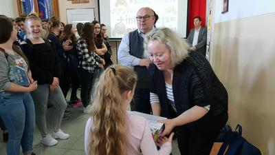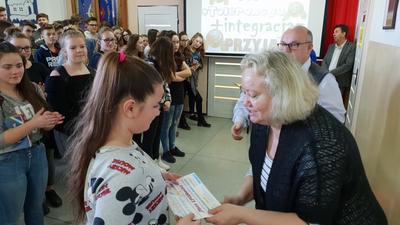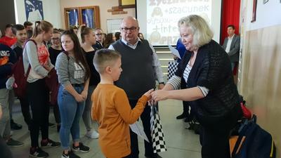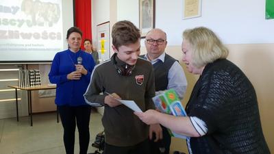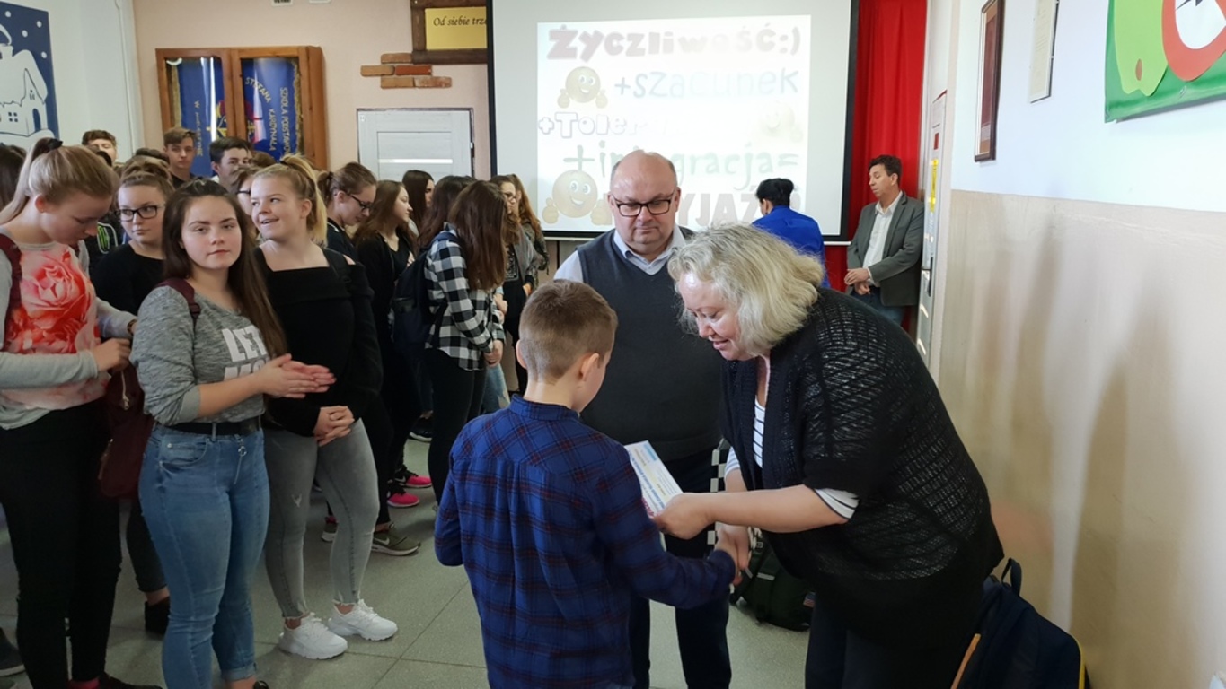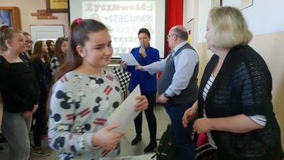 Pani Dyrektor Dorota Spychała i pan Wicedyrektor Piotr Matysiak serdecznie pogratulowali laureatom oraz wręczyli im zaprojektowane przez panią pedagog dyplomy i upominki ufundowane przez Gminną Komisję ds. Profilaktyki i Rozwiązywania Problemów Alkoholowych oraz Przeciwdziałania Narkomanii w Mieleszynie. Nie zabrakło też gromkich braw od całej społeczności szkolnej i pamiątkowego zdjęcia.