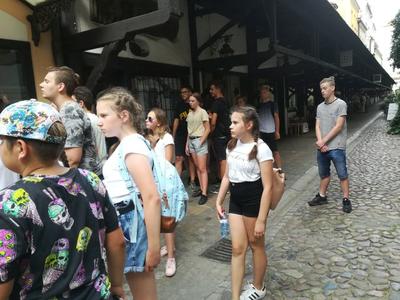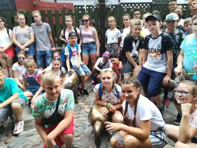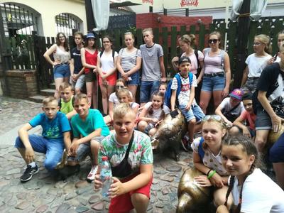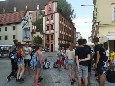 Po krótkim odpoczynku i lodach udaliśmy się na Stare Miasto. Spotkaliśmy się z panią przewodnik, która oprowadziła nas po najciekawszych zakątkach Wrocławia. Zobaczyliśmy m.in. najcenniejsze kamienice, pomnik Aleksandra Fredry, budynek ratusza oraz dwa małe domki nazwane „Jasiem” i „Małgosią”. Byliśmy także na Placu Solnym, na którym kiedyś handlowano solą, a obecnie przez całą dobę sprzedaje się tam kwiaty. Mieliśmy okazję być również na Starych Jatkach – małej uliczce, na której od XII wieku sprzedawano mięso, natomiast dzisiaj znajdują się tam galerie sztuki oraz Pomnik Pamięci Zwierząt Rzeźnych. Widzieliśmy także gmach Uniwersytetu Wrocławskiego, na którym mieszczą się figury czterech cnót kardynalnych: Sprawiedliwości, Męstwa, Roztropności, Umiarkowania. Miasto to znane jest z ukrytych na ulicach i w zaułkach niewielkich rzeźb krasnali. Obecnie jest ich 283 i stale zwiększa się ich liczba. Pani przewodnik pokazała kilka z nich, reszta małych istot już sama rzucała nam się w oczy, mimo ich skromnego wzrostu. Widzieliśmy m.in. Syzyfki, Budowniczego, Więźnia przy Starym Więzieniu, Życzliwka i wiele innych.