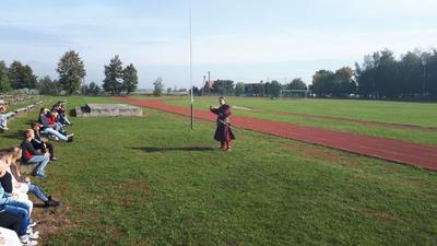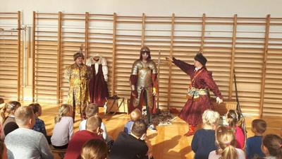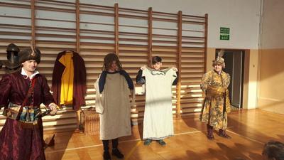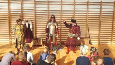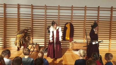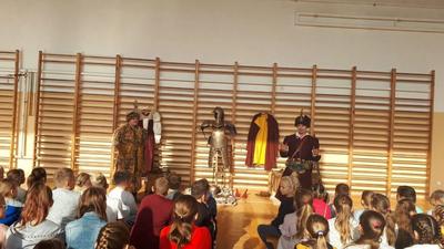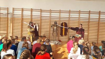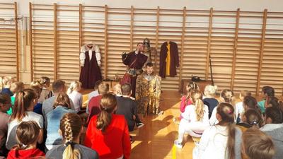 27 września uczniowie naszej szkoły mogli wziąć udział w żywej lekcji historii, dzięki której poznali lub przypomnieli sobie najważniejsze wydarzenia z okresu od II połowy XVI wieku do końca wieku XVII. Dzieci zobaczyły pokaz walki na szable oraz prezentację strojów i oręża z XVII w. Wybrańcy mogli przymierzyć i zaprezentować zbroję husarską, sukmanę chłopską czy suknię szlachcianki. Uczniowie wzięli także udział w konkursie podsumowującym wiadomości zdobyte w trakcie trwania spektaklu. Zwycięzcy otrzymali w nagrodę Dukat Gdański Jana III Sobieskiego. Na koniec czekała na wszystkich głośna niespodzianka – wystrzał z broni czarno prochowej: repliki pistoletu skałkowego z XVII wieku.