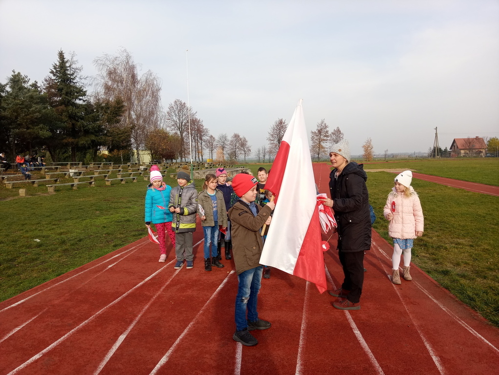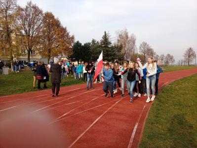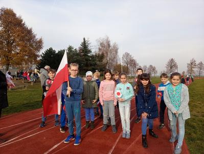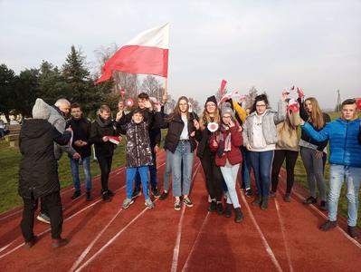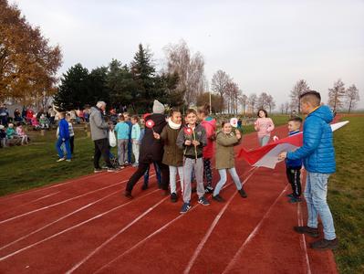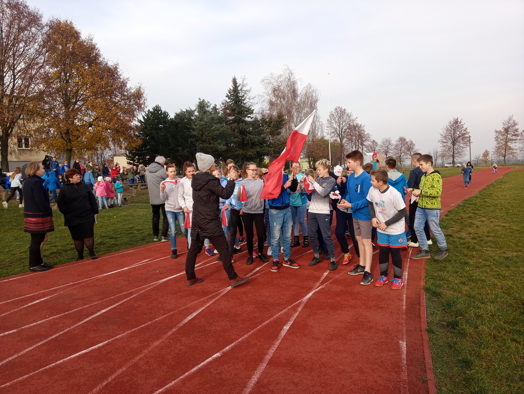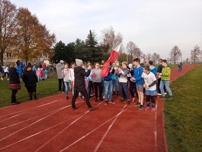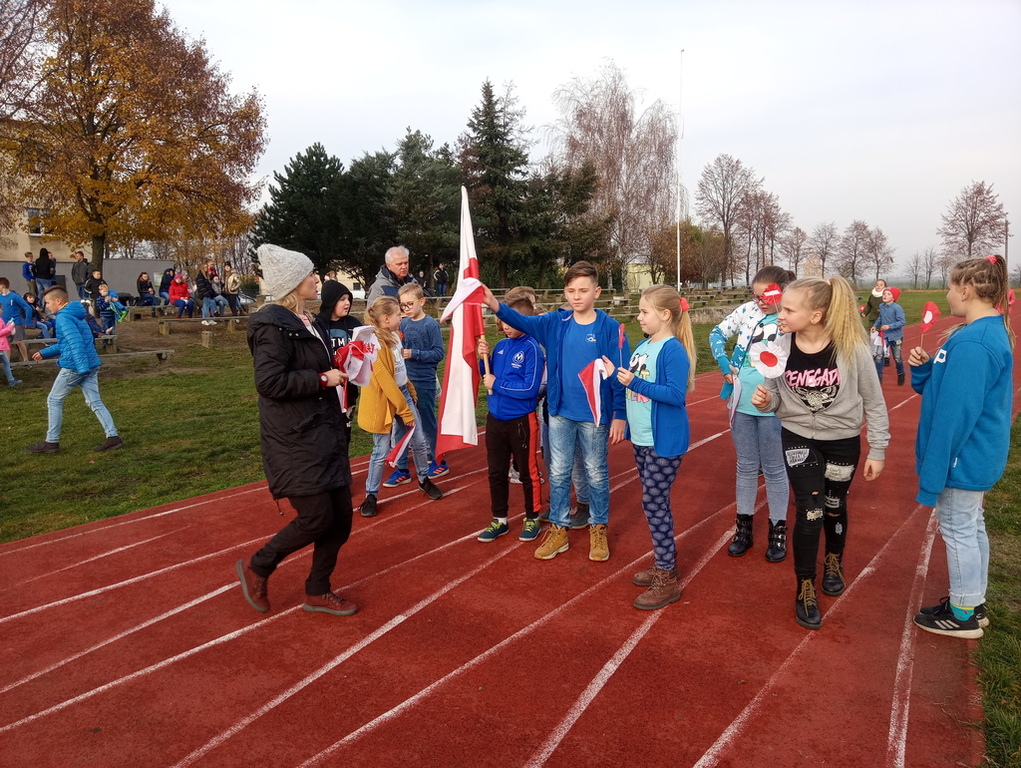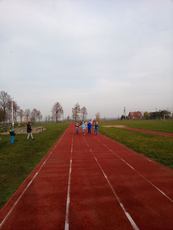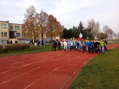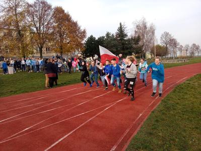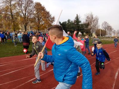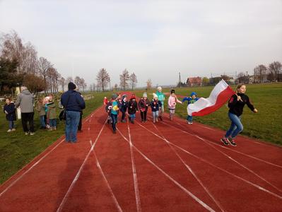 Zwieńczeniem obchodów Święta Odzyskania Niepodległości przez nasz kraj, w naszej szkole, po zeszłotygodniowych uroczystościach była sztafeta pod hasłem „ Dla Niepodległej”. Nazwa i symbolika (białoczerwone barwy) pomału stają się tradycją corocznych spotkań, aby na sportowo uczcić tą ważną dla każdego Polaka datę. W końcu dopisała nam pogoda. W biegu mógł wziąć udział każdy. Oczywiście chętnych nie zabrakło. Za białoczerwoną flagą biegali po kolei uczniowie wszystkich klas. Na mecie na każdego czekał słodki upominek. W sztafecie wystartowali także zaproszeni przedszkolacy.