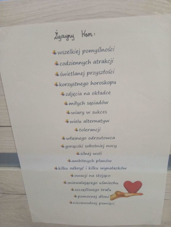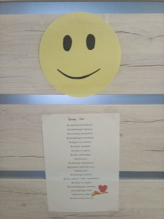 21 listopada świętowaliśmy wśród społeczności uczniowskiej Dzień Życzliwości. Z tej okazji Samorząd Szkolny napisał dla każdej klasy życzenia z uśmiechniętą buźką, które zostały powieszone na drzwiach poszczególnych sal lekcyjnych. Pamiętajmy o tym, żeby być dla siebie życzliwymi i miłymi, nie tylko w tym szczególnym dniu, lecz codziennie.  Wtedy świat będzie na pewno lepszy, a nam wszystkim będzie się żyło piękniej!!! :) :) :)