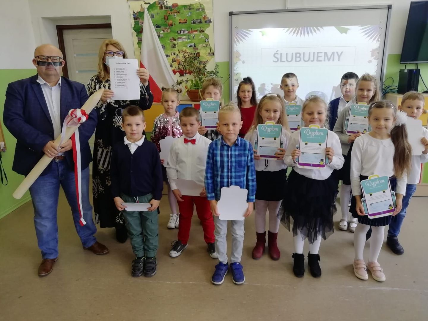 Dzisiaj w naszej szkole odbyła się bardzo ważna uroczystość- Pasowanie na Ucznia. To wydarzenie zawsze wzbudza dużo emocji wśród całej społeczności szkolnej. Uroczystość Pasowania rozpoczęła się odśpiewaniem hymnu, a następnie wystąpieniem dyrektora szkoły pana Piotra Matysiaka. Pierwszoklasiści udzielili prawidłowych odpowiedzi podczas krótkiego quizu dotyczącego znajomości naszej szkoły. Następnie pierwszaki zaprezentowały swoje umiejętności recytatorskie i wokalne. Najważniejszym elementem uroczystości było złożenie przez dzieci ślubowania na sztandar szkoły oraz pasowanie na uczniów. Każdy odcisnął również swój kciuk na pamiątkę tego wyjątkowego wydarzenia. Na koniec dzieci otrzymały pamiątkowe dyplomy oraz upominki.
