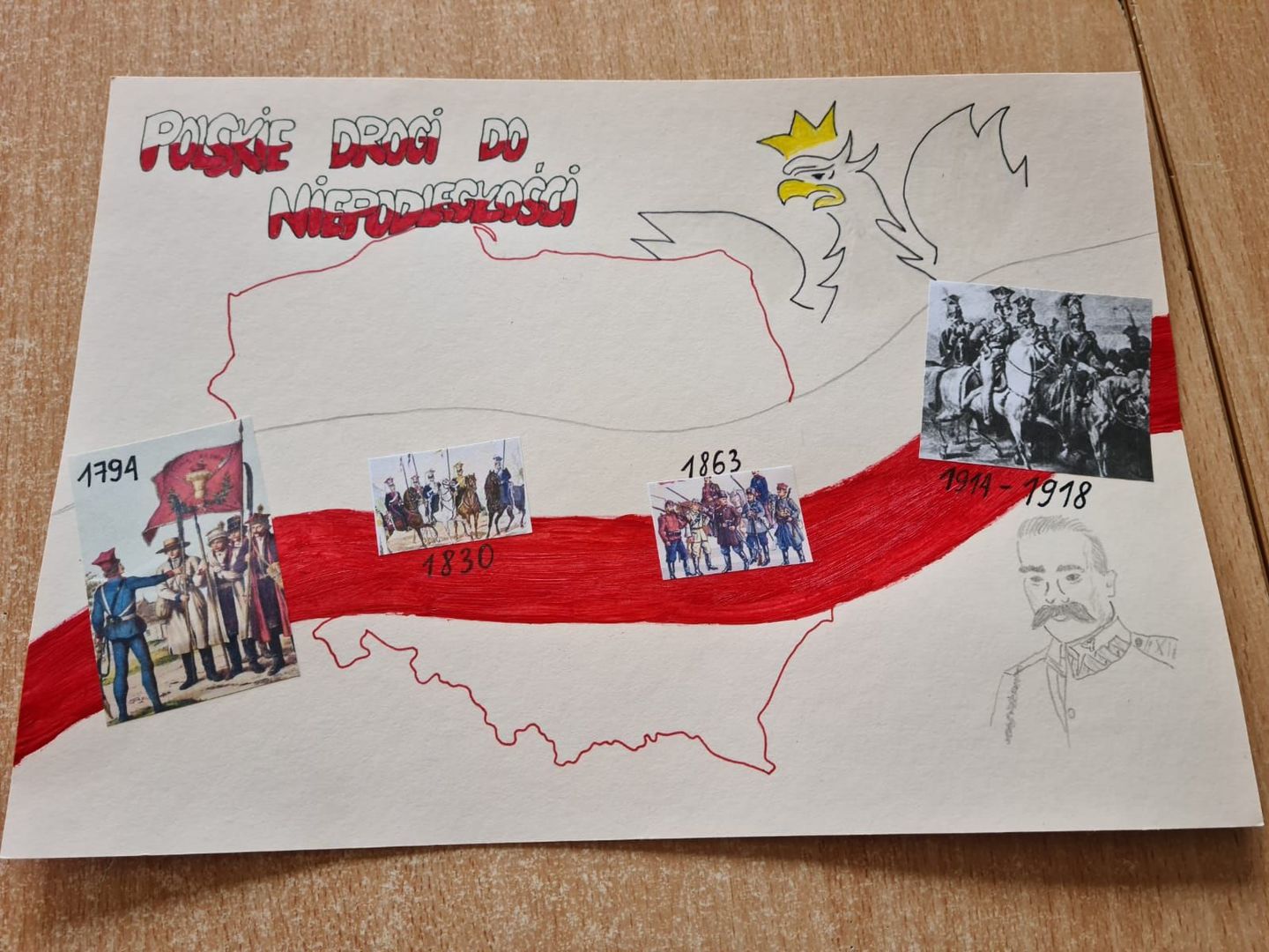 11. listopada obchodzimy 102. rocznicę odzyskania niepodległości przez Polskę. W ramach obchodów tej rocznicy zaprosiliśmy uczniów do wzięcia udziału w Szkolnym Konkursie Plastycznym:“ Symbole narodowe” -klasy 1-3 oraz “Polskie drogi do niepodległości” - klasy 4-8. Prace można było wykonać różnymi technikami: malarską, rysunkową czy graficzną. W konkursie wzięło udział 19 uczniów. W kategorii klas 1-3 zwyciężył Gabriel Bosacki z klasy 3., natomiast z klas 4-8- laureatem został Tomasz Kordek z klasy 7. Na specjalne wyróżnienie zasługuje również praca Magdaleny Nowickiej z klasy 8. Ze względu na panującą sytuację epidemiczną, nagrody i dyplomy dla uczestników konkursu zostaną wręczone po powrocie do szkoły. Zwycięzcom gratulujemy, a reszcie uczestników dziękujemy za zaangażowaniei piękne prace. Podziękowania kierujemy także w stronę Rodziców za wsparcie dzieci podczas realizacji projektu.
