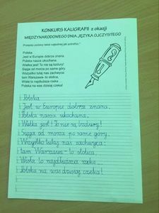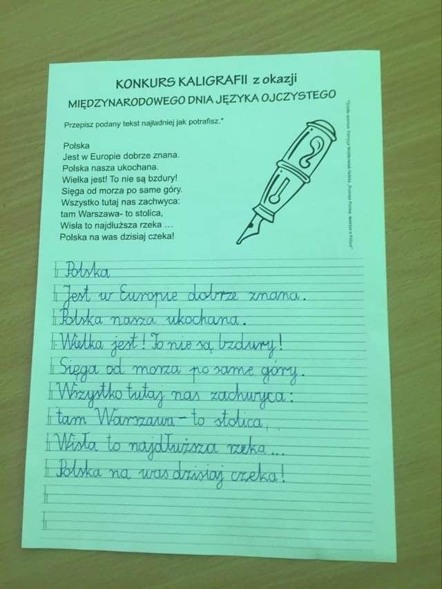 Uczniowie klasy drugiej z okazji Międzynarodowego Dnia Języka Ojczystego, który przypada 21 lutego brali udział w konkursie kaligrafii.
