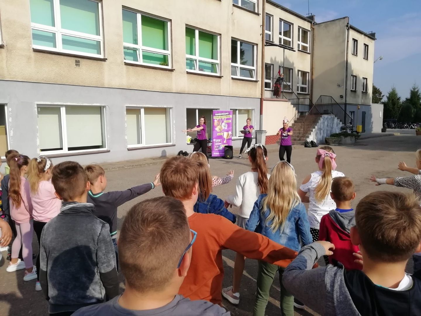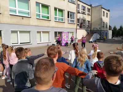 Do naszej szkoły zawitały gościnnie panie z Centrum Rozwoju Młodego Człowieka HAJDASZ. Przeprowadziły pokaz taneczny oraz włączyły naszych uczniów do współnej zabawy tanecznej. Instruktorki tańca gorąco zachęcały do udziału w zajęciach dodatkowych na terenie naszej szkoły. Na zajęciach integracyjno- edukacyjnych HAJDASZ dzieci uczą się różnych stylów tańca, poznają choreografię taneczną oraz nauke o zasadach fair- play. Nasi uczniowie podczas pokazu na świeżym powietrzu bawili się wyśmienicie !!!