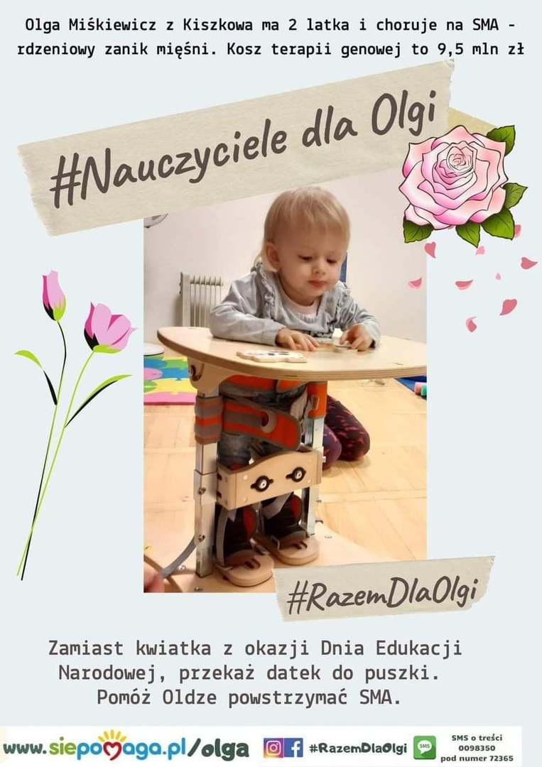 Pomocy małej Oldze ciąg dalszy! Informujemy, że nasza szkoła włączyła się w akcję z okazji Dnia Edukacji Narodowej polegającą na zastępowaniu potencjalnych kwiatków dla nauczycieli datkiem do puszki na rzecz chorującej Olgi.