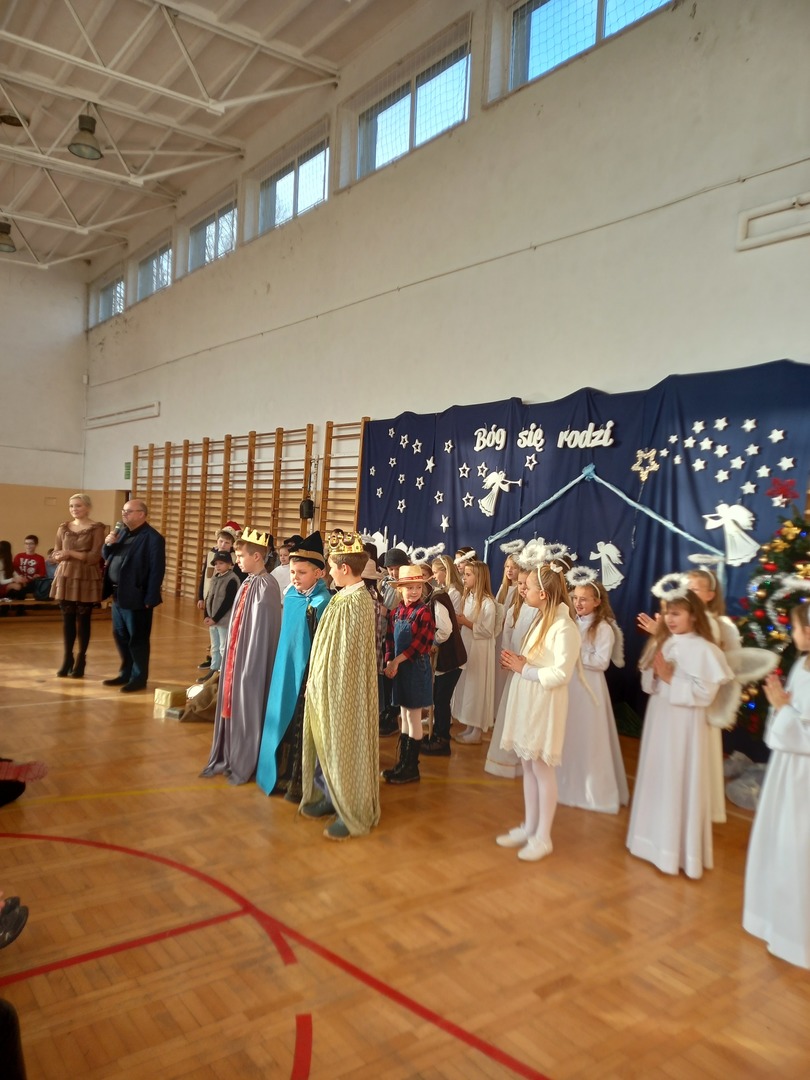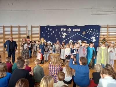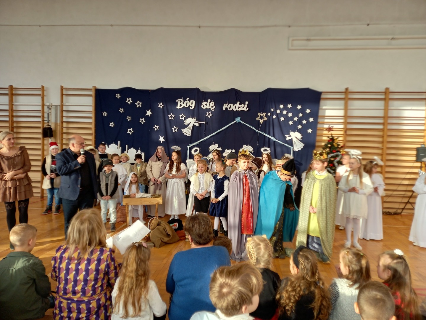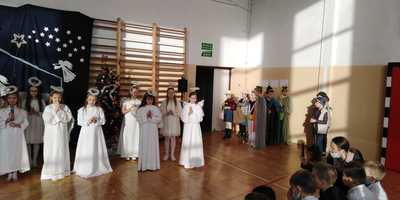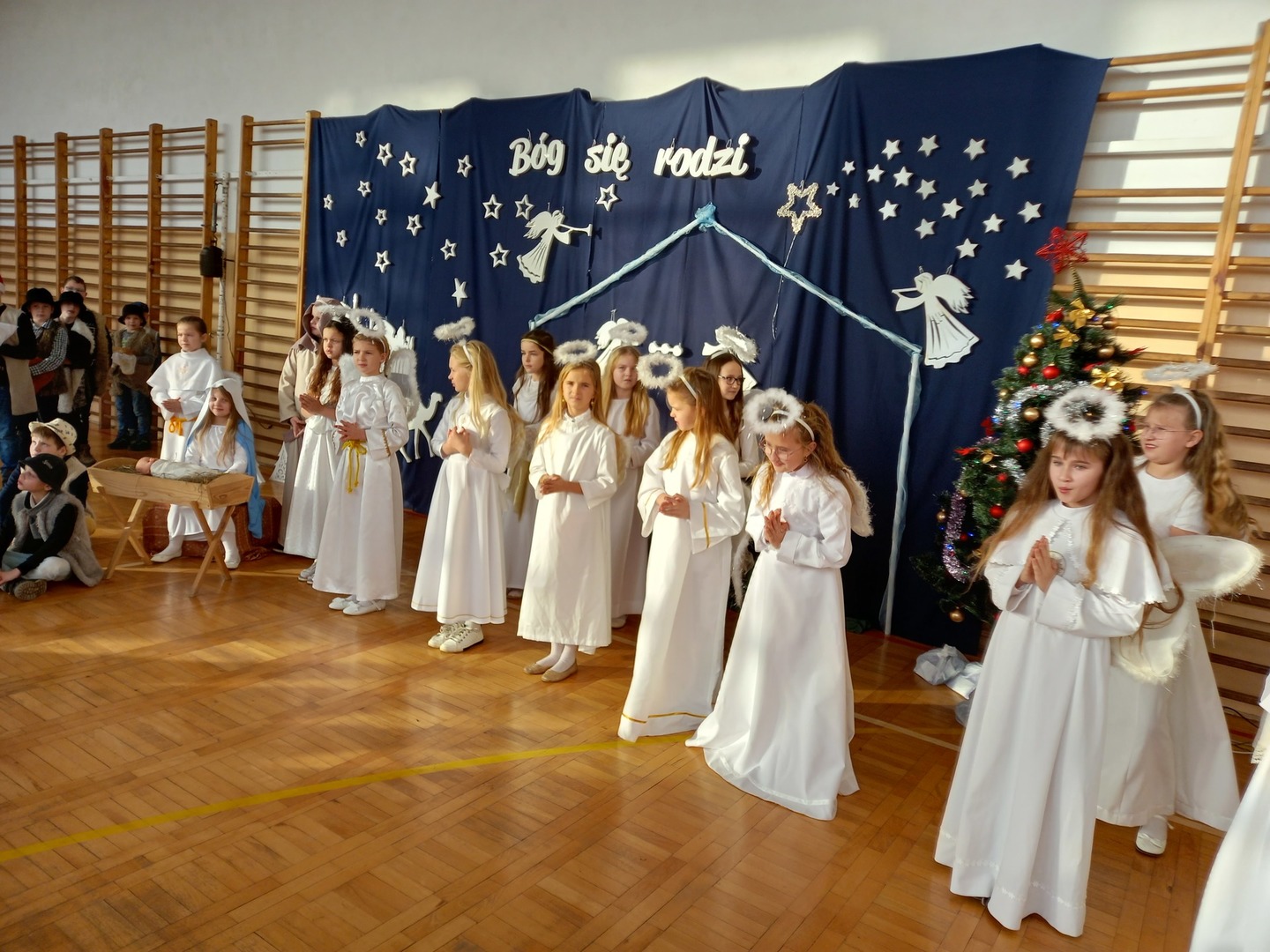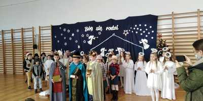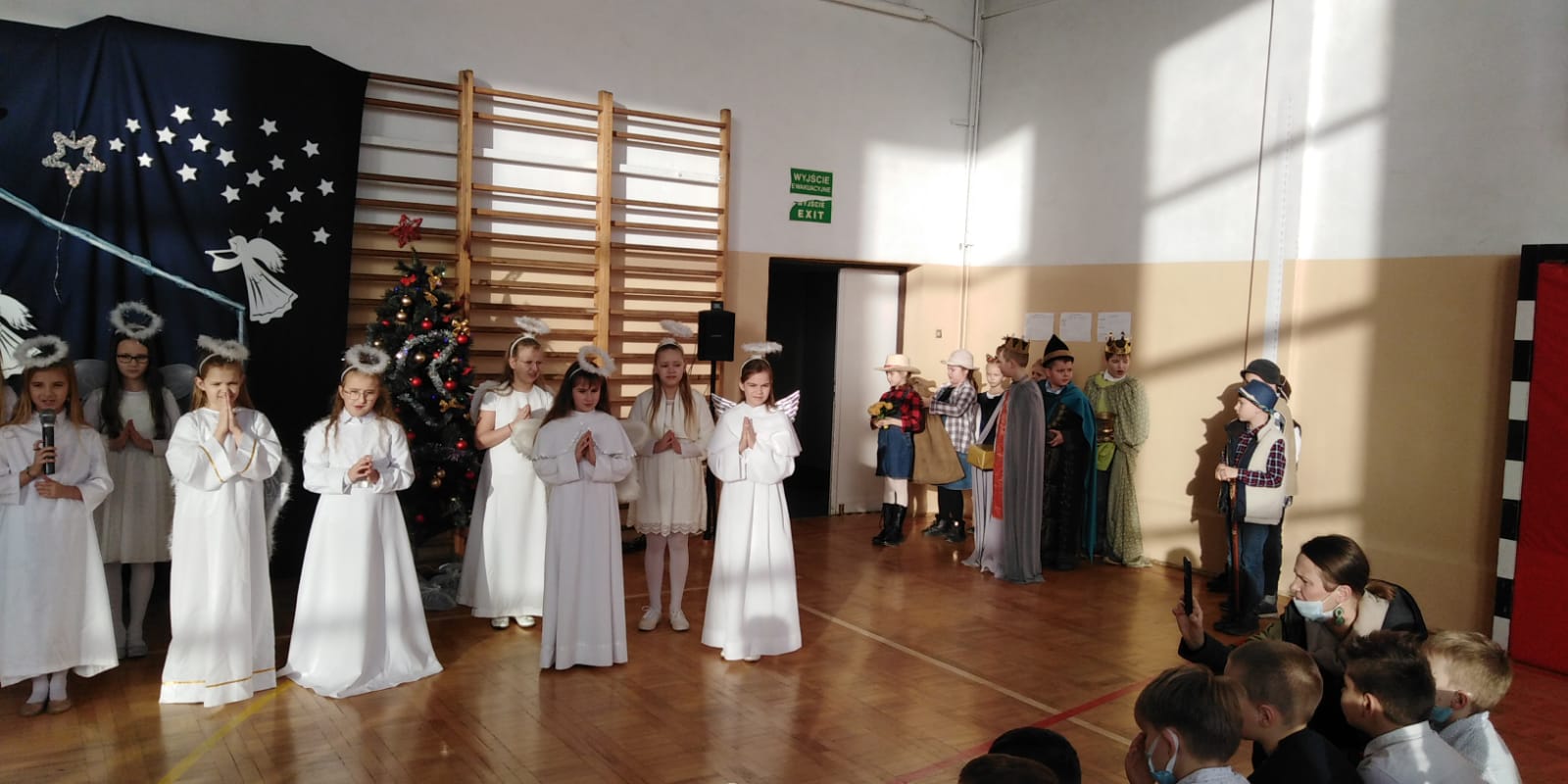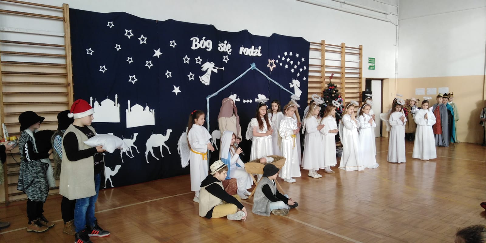 Ze Świętami Bożego Narodzenia wiąże się wiele pięknych tradycji i zwyczajów. Jednym z nich jest odgrywanie inscenizacji zwanych Jasełkami. W tegoroczną świąteczną atmosferę wprowadzili nas uczniowie najmłodszych klas, którzy pod opieką pani Hanny Nawrockiej i pani Elżbiety Wesołowskiej przygotowali przedstawienie jasełkowe. Zaprezentowali je 17 grudnia dla całej społeczności uczniowskiej, przypominając wydarzenia sprzed ponad dwóch tysięcy lat, kiedy to w Betlejem narodziło się Boże Dzieciątko. Dzieci wcieliły się w rolę Maryi i Józefa, pasterzy, aniołów oraz trzech króli, przybywających złożyć pokłon Jezusowi narodzonemu w ubogiej stajence. Uroku całej inscenizacji dodały kolędy, które napełniły wszystkich świąteczną radością i sprawiły, że poczuliśmy magię zbliżających się świąt. Zarówno uczniowie jak i nauczyciele włączyli się do wspólnego kolędowania. W tym dniu został rozstrzygnięty Konkurs na Najpiękniejszą Kartkę Bożonarodzeniowa. Laureaci otrzymali nagrody i pamiątkowe dyplomy. Głos zabrał również pan Dyrektor Piotr Matysiak, który złożył wszystkim zebranym świąteczne życzenia, a przewodnicząca rady rodziców pani Katarzyna Rzeczkowska przekazała na ręce przewodniczących klas słodkie upominki. Spędziliśmy wspólnie piękny, magiczny czas.