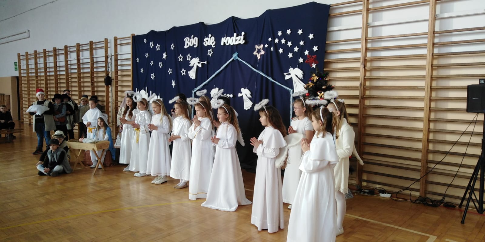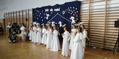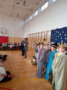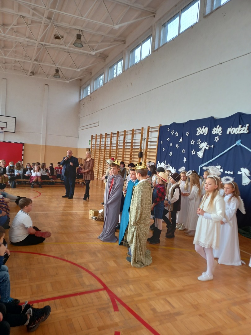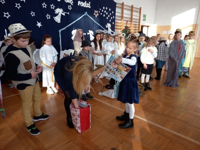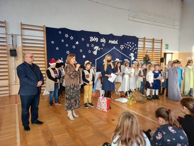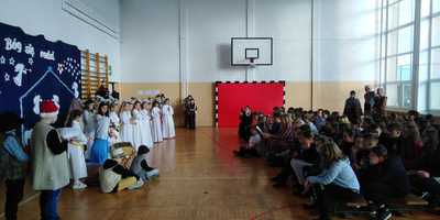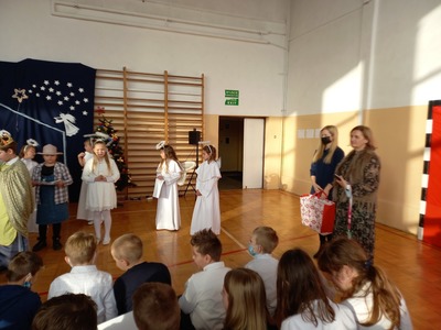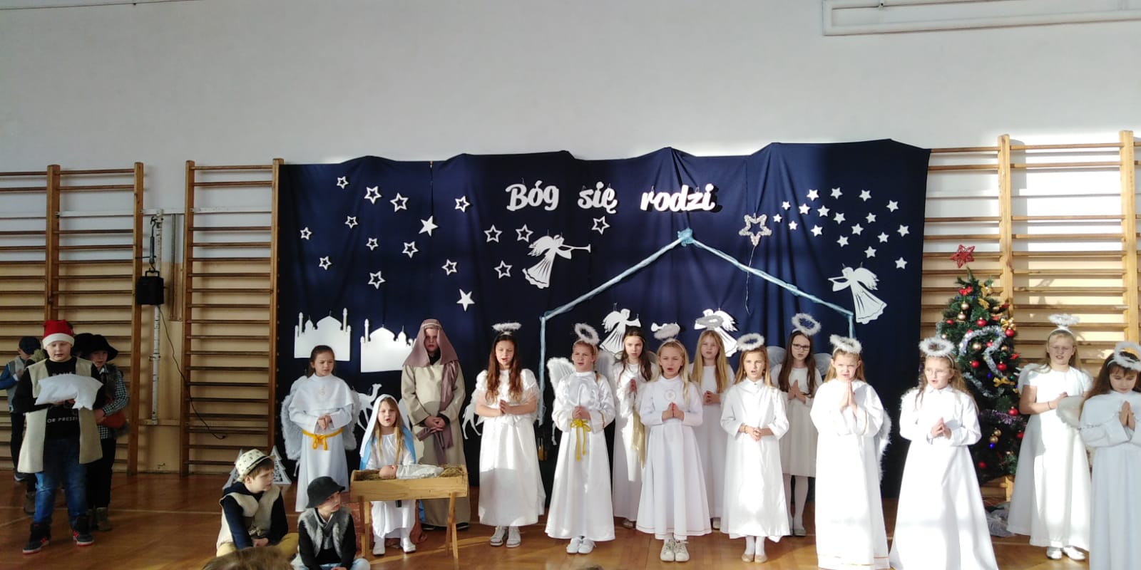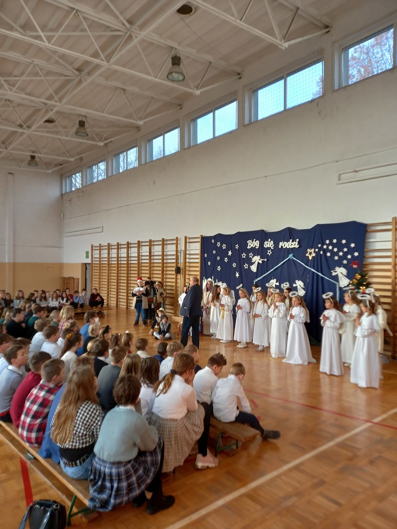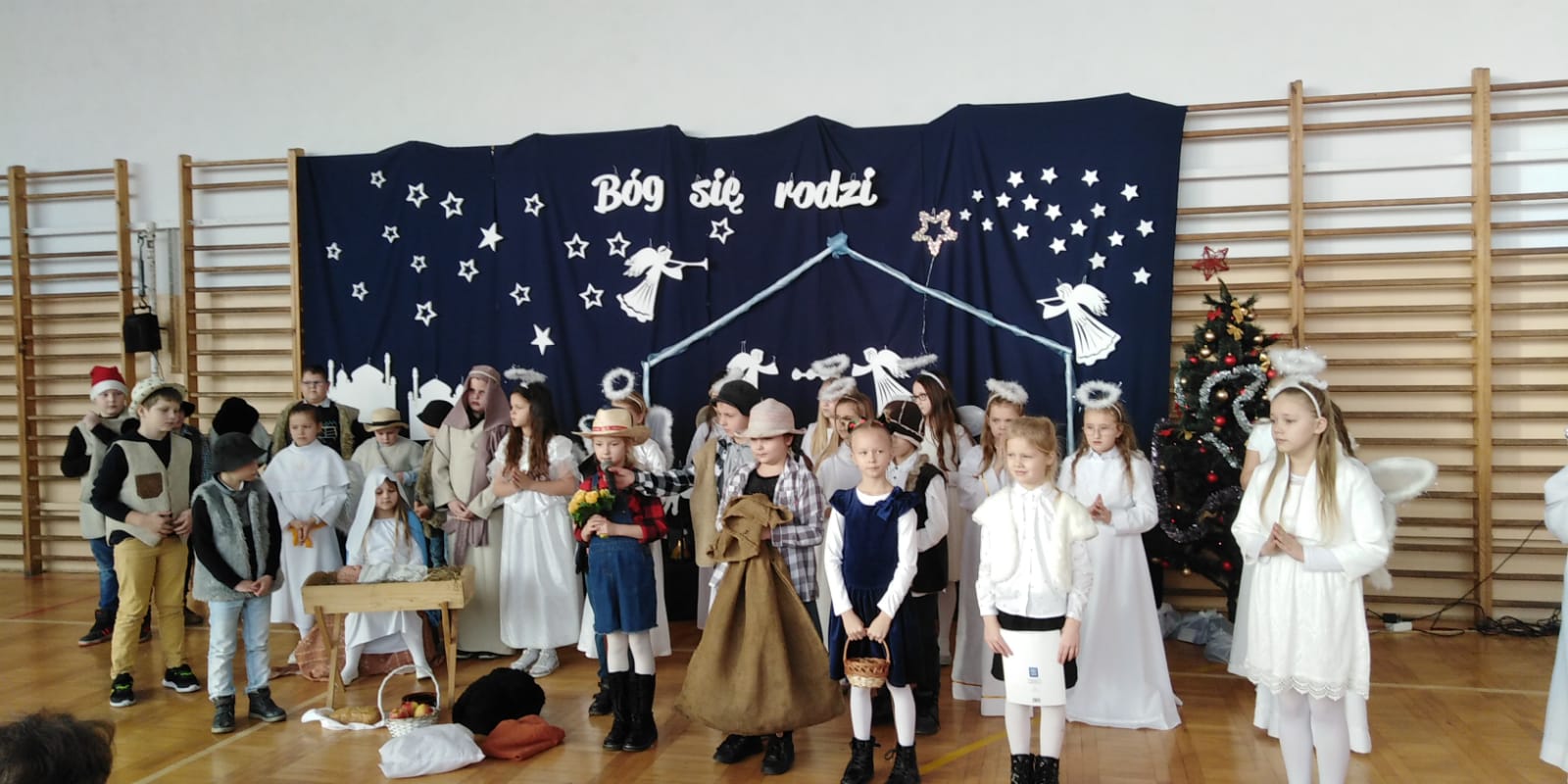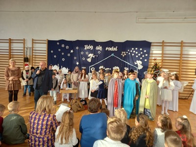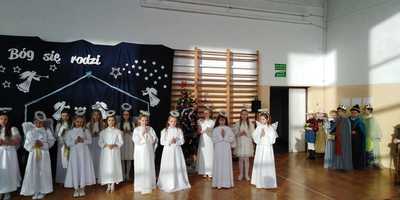 Ze Świętami Bożego Narodzenia wiąże się wiele pięknych tradycji i zwyczajów. Jednym z nich jest odgrywanie inscenizacji zwanych Jasełkami. W tegoroczną świąteczną atmosferę wprowadzili nas uczniowie najmłodszych klas, którzy pod opieką pani Hanny Nawrockiej i pani Elżbiety Wesołowskiej przygotowali przedstawienie jasełkowe. Zaprezentowali je 17 grudnia dla całej społeczności uczniowskiej, przypominając wydarzenia sprzed ponad dwóch tysięcy lat, kiedy to w Betlejem narodziło się Boże Dzieciątko. Dzieci wcieliły się w rolę Maryi i Józefa, pasterzy, aniołów oraz trzech króli, przybywających złożyć pokłon Jezusowi narodzonemu w ubogiej stajence. Uroku całej inscenizacji dodały kolędy, które napełniły wszystkich świąteczną radością i sprawiły, że poczuliśmy magię zbliżających się świąt. Zarówno uczniowie jak i nauczyciele włączyli się do wspólnego kolędowania. W tym dniu został rozstrzygnięty Konkurs na Najpiękniejszą Kartkę Bożonarodzeniowa. Laureaci otrzymali nagrody i pamiątkowe dyplomy. Głos zabrał również pan Dyrektor Piotr Matysiak, który złożył wszystkim zebranym świąteczne życzenia, a przewodnicząca rady rodziców pani Katarzyna Rzeczkowska przekazała na ręce przewodniczących klas słodkie upominki. Spędziliśmy wspólnie piękny, magiczny czas.