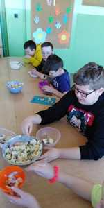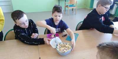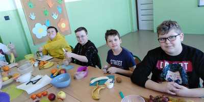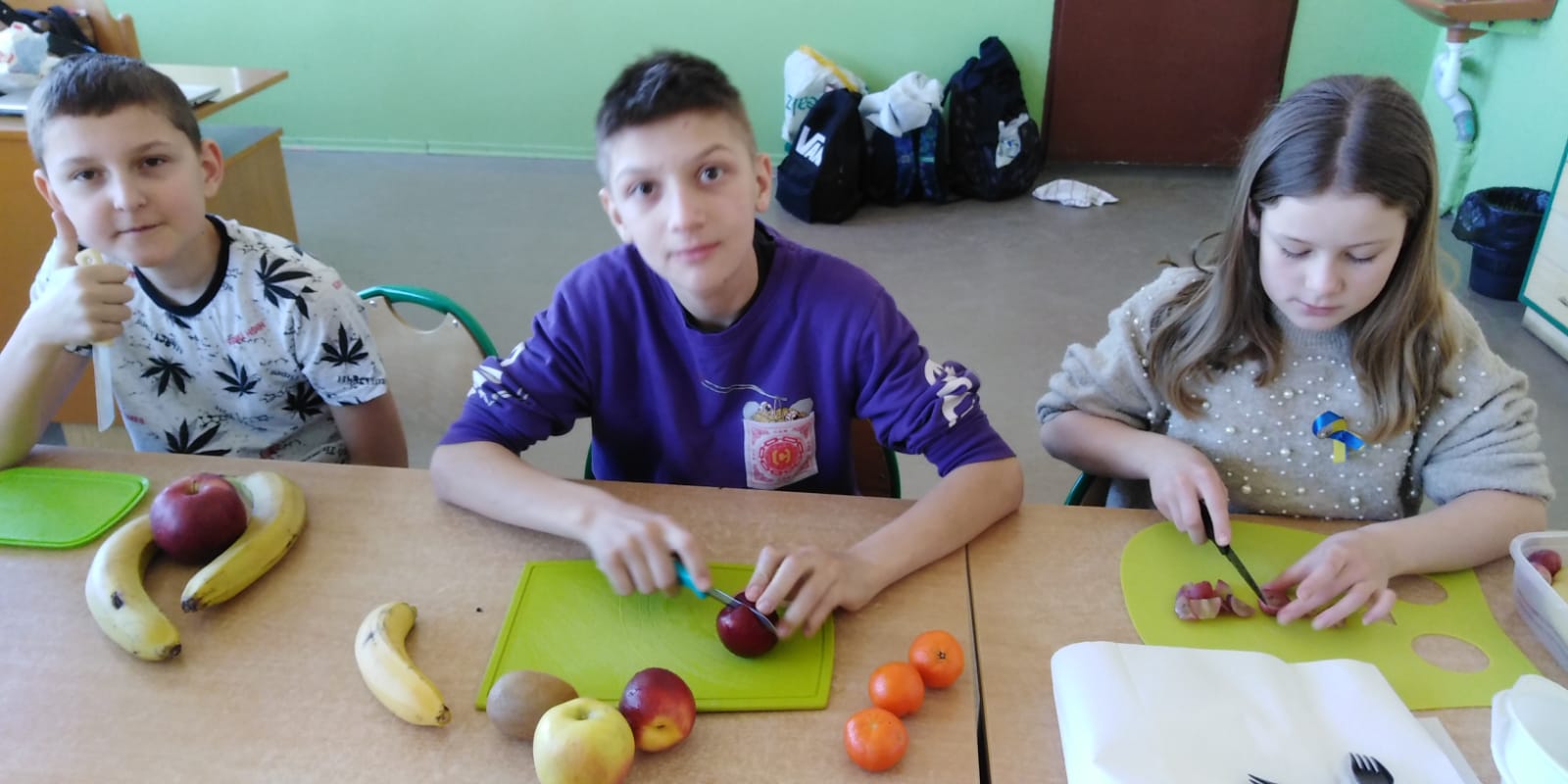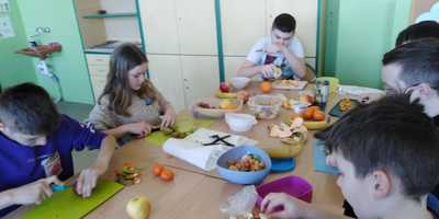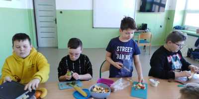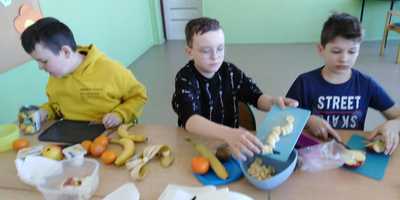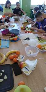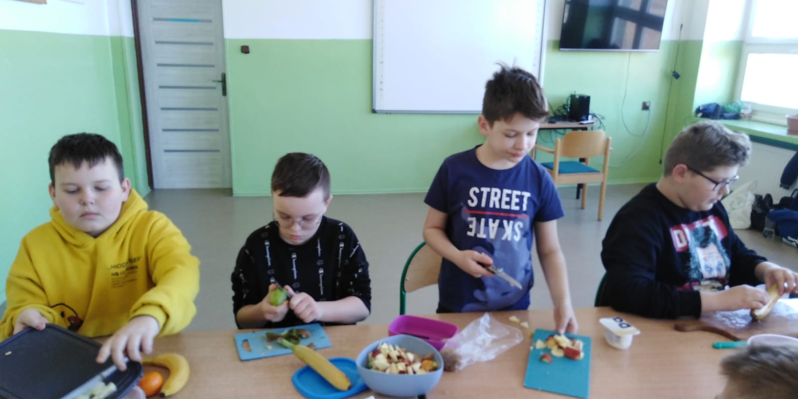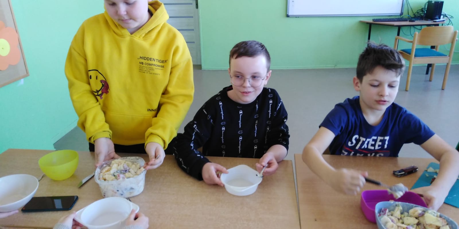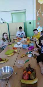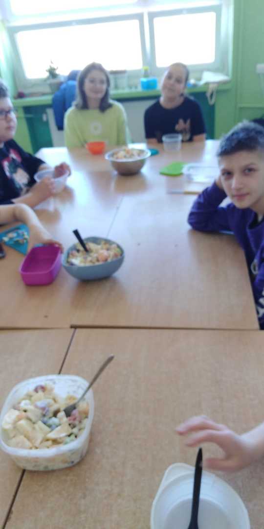 W zeszłym tygodniu klasa 6 brała udział w nietypowej lekcji języka angielskiego związanej ze słownictwem przydatnym w kuchni. Oprócz poznania nazw owoców i czasowników związanych z gotowaniem, mogła przygotować przepyszną sałatkę owocową. Robienie sałatki owocowej było wielką frajdą i zabawą, uczniowie przygotowali się do tego solidnie. Każdy przyniósł z domu potrzebne akcesoria i różne owoce. Po wcześniejszym ich umyciu wszyscy zabrali się do pracy. Dobrze to widać na załączonych zdjęciach. Wszystkim zrobiona sałatka bardzo smakowała, a do tego wzbogaciliśmy nasz słownik języka angielskiego.