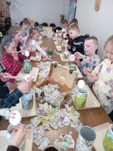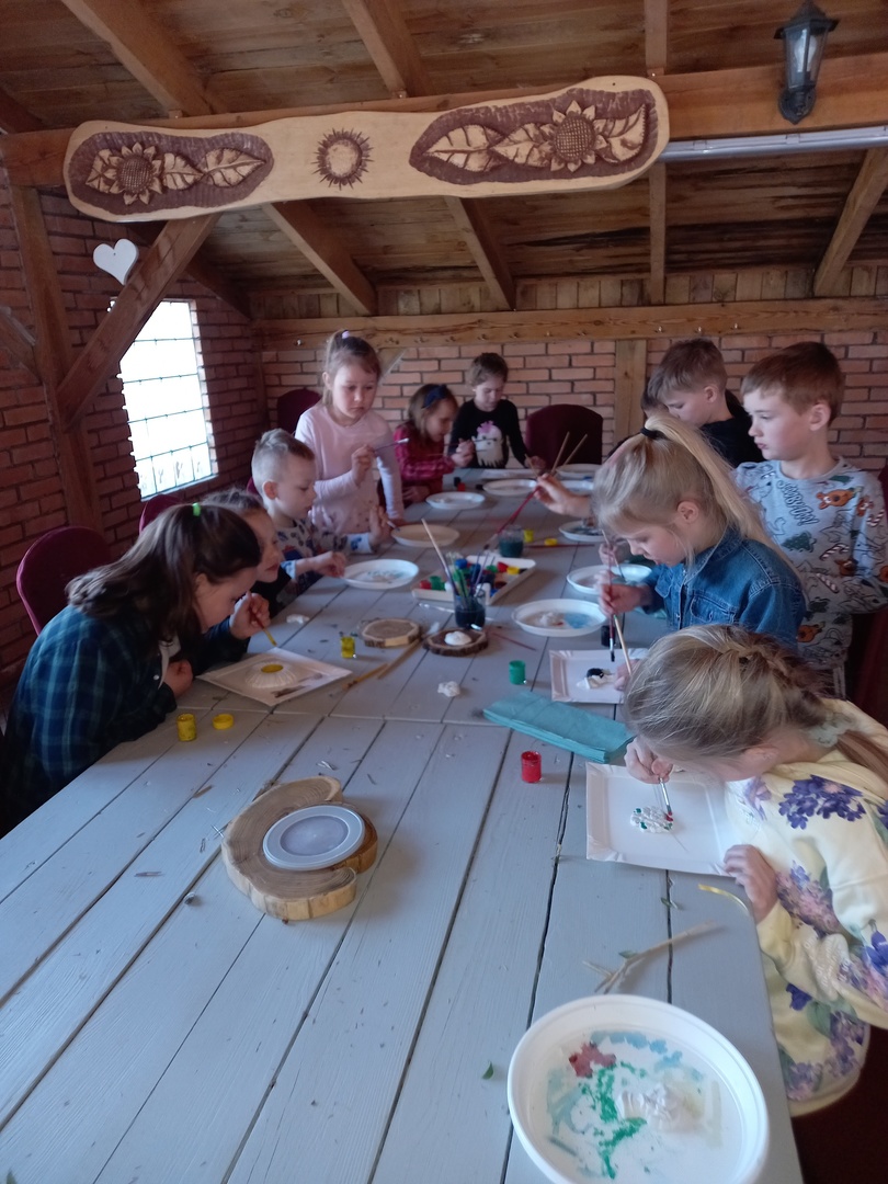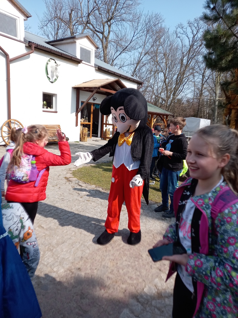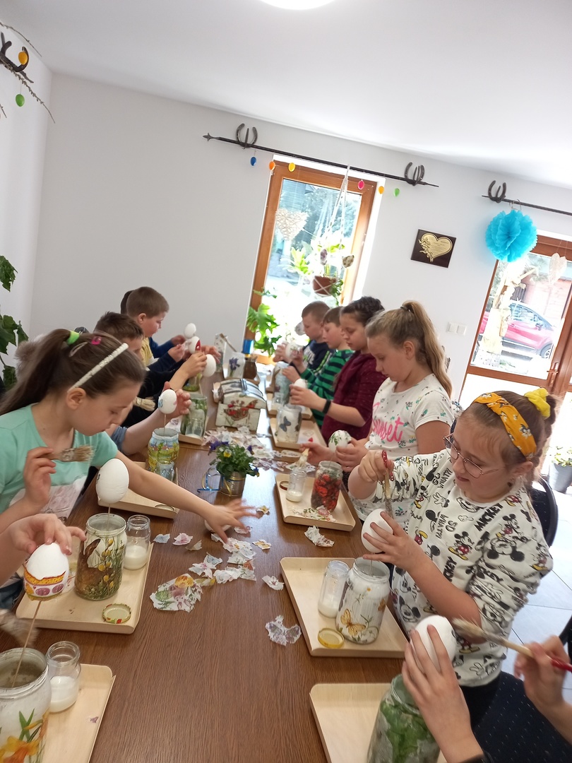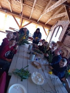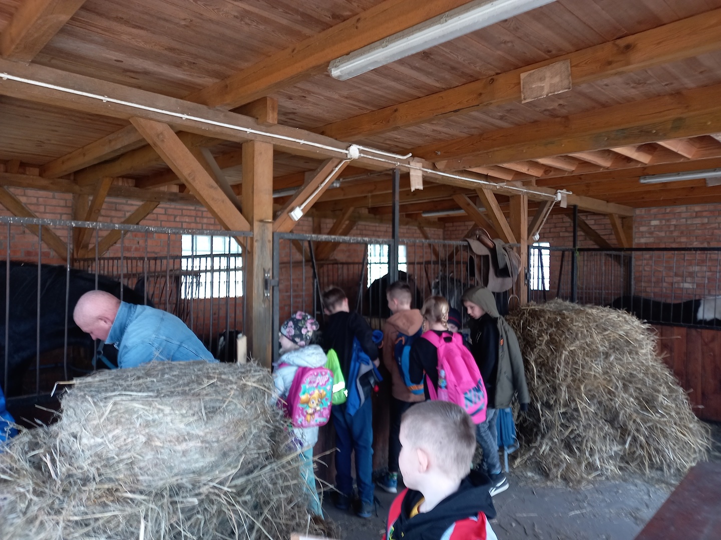W piątek najmłodsi uczniowie z klas 1-3 wzięli udział w kreatywnych warsztatach, które wprowadziły ich w klimat Świąt Wielkanocnych. Na wstępie pani opowiedziała wszystkim dzieciom o tradycjach związanych z tym ważnym świętem. Klasy pracowały warsztatowo podzielone na trzy grupy. Wykonywano wielkanocne jajka metodą decupage. Były warsztaty z gipsu, na których dzieci malowały różne gipsowe figurki związane z symboliką wielkanocną. Podczas warsztatów kulinarnych pieczono i dekorowano ciasteczka, które jeszcze ciepłe znikały w tempie błyskawicznym. Każde dziecko wykonywało również samodzielnie stroik wielkanocny. Po słodkim poczęstunku (wata cukrowa, fontanna czekoladowa) poszliśmy z wizytą do stajni. Głaskaliśmy konie, osiołka oraz karmiliśmy kozy, owce i króliczki. Niewątpliwą furorę i mnóstwo emocji wśród uczniów wywołał byk Fernando, na którym przejażdżka okazała się nielada wyzwaniem. Był również czas wolny, były gry, zabawy i sklepik z pamiątkami. Przy pięknej pogodzie udało nam się bardzo aktywnie i twórczo spędzić szkolny dzień.