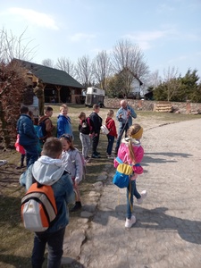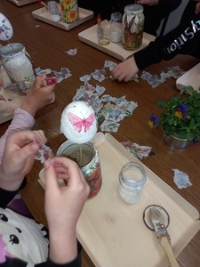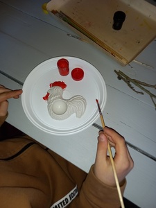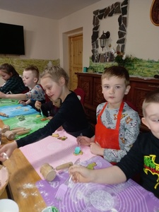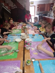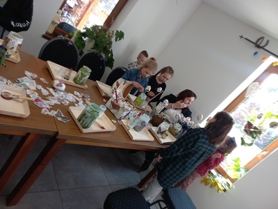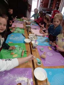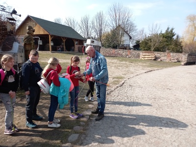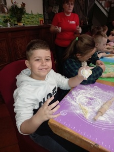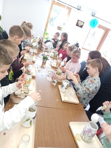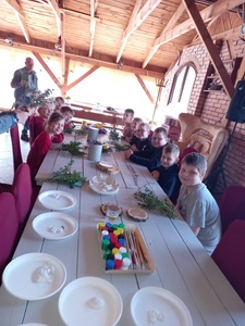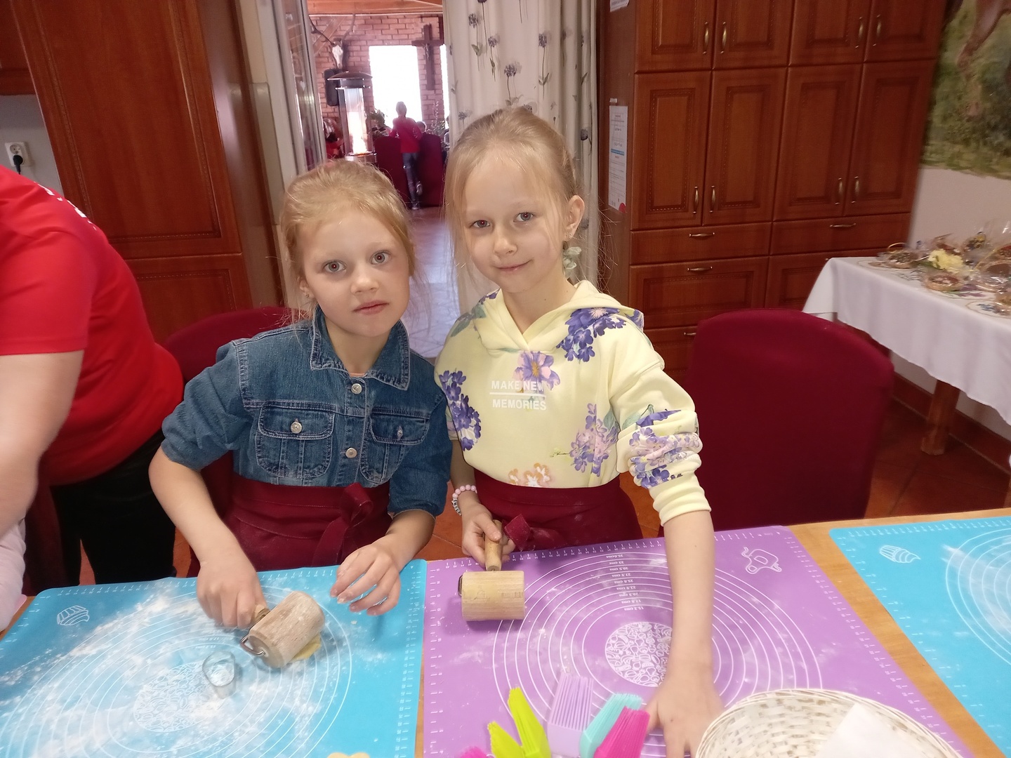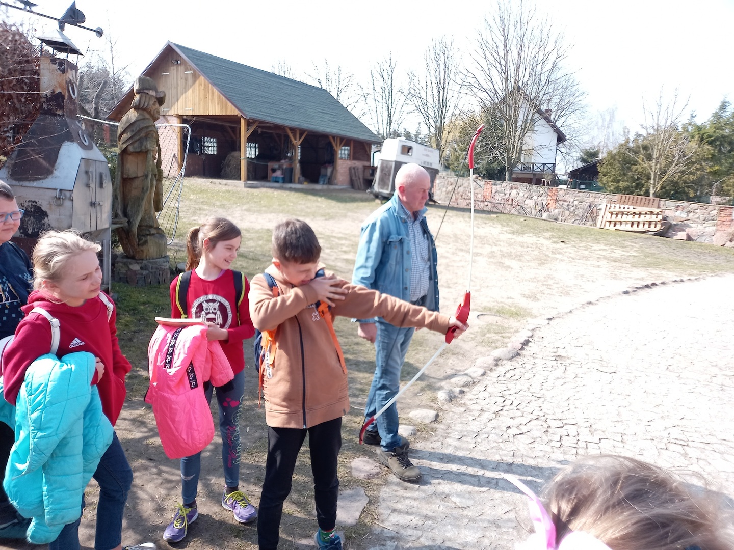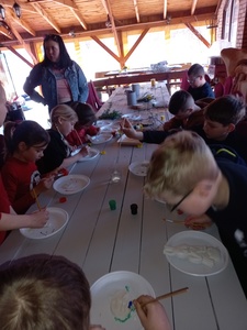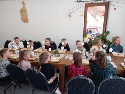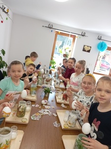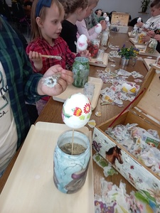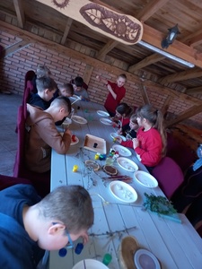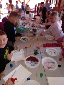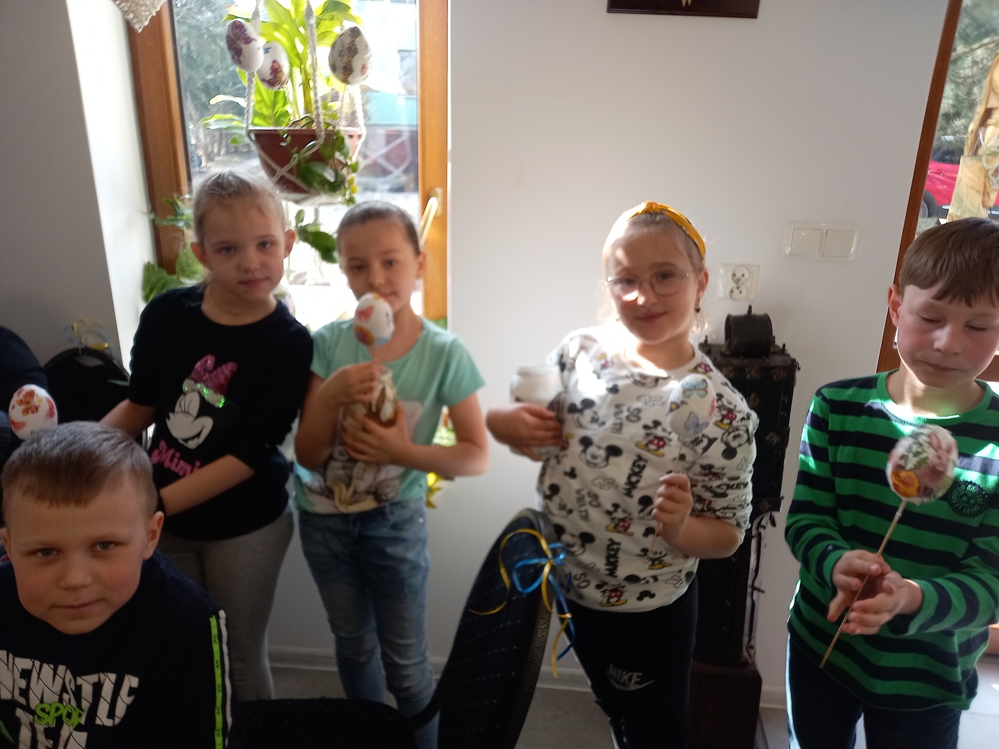 W piątek najmłodsi uczniowie z klas 1-3 wzięli udział w kreatywnych warsztatach, które wprowadziły ich w klimat Świąt Wielkanocnych. Na wstępie pani opowiedziała wszystkim dzieciom o tradycjach związanych z tym ważnym świętem. Klasy pracowały warsztatowo podzielone na trzy grupy. Wykonywano wielkanocne jajka metodą decupage. Były warsztaty z gipsu, na których dzieci malowały różne gipsowe figurki związane z symboliką wielkanocną. Podczas warsztatów kulinarnych pieczono i dekorowano ciasteczka, które jeszcze ciepłe znikały w tempie błyskawicznym. Każde dziecko wykonywało również samodzielnie stroik wielkanocny. Po słodkim poczęstunku (wata cukrowa, fontanna czekoladowa) poszliśmy z wizytą do stajni. Głaskaliśmy konie, osiołka oraz karmiliśmy kozy, owce i króliczki. Niewątpliwą furorę i mnóstwo emocji wśród uczniów wywołał byk Fernando, na którym przejażdżka okazała się nielada wyzwaniem. Był również czas wolny, były gry, zabawy i sklepik z pamiątkami. Przy pięknej pogodzie udało nam się bardzo aktywnie i twórczo spędzić szkolny dzień.