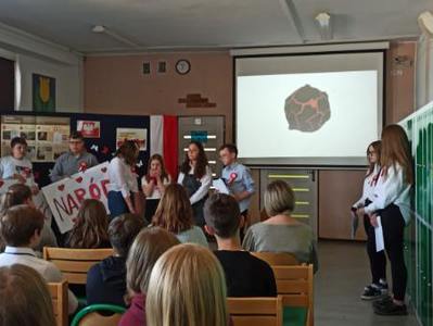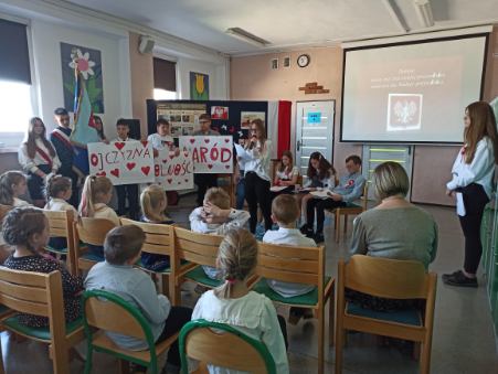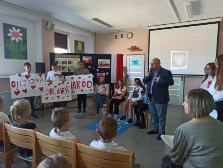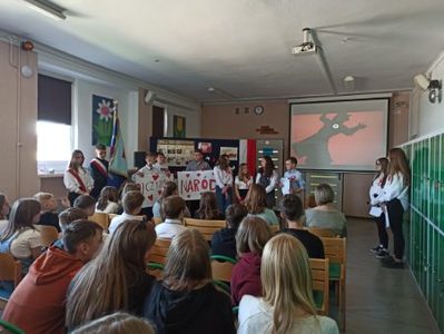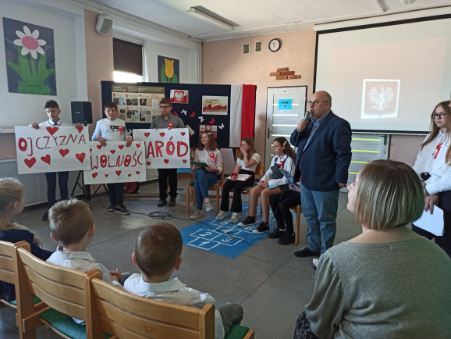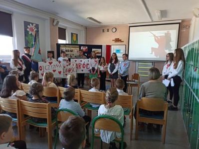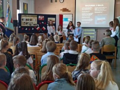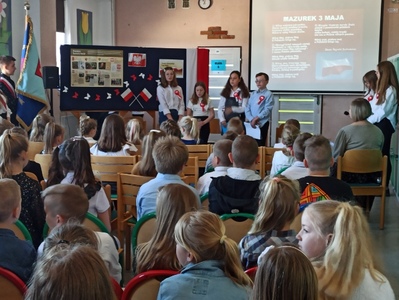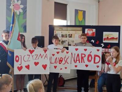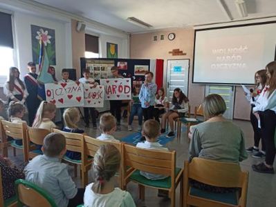 29 kwietnia odbyła się w naszej szkole uroczysta akademia poświęcona rocznicy uchwalenia Konstytucji 3 Maja. Klasa 6. przygotowała z tej okazji montaż słowno-muzyczny. Uczniowie przybliżyli reszcie społeczności szkolnej okoliczności powstania naszej pierwszej konstytucji i jej najważniejsze postanowienia oraz rozważyli słowa, jakże ważne w obecnej sytuacji geopolitycznej: WOLNOŚĆ, NARÓD, OJCZYZNA. Klasa 6. nie tylko przypomniała ważne wydarzenie z historii naszego kraju, ale też zachęciła wszystkich do refleksji nad hasłami, które powinny być ważne dla każdego Polaka.