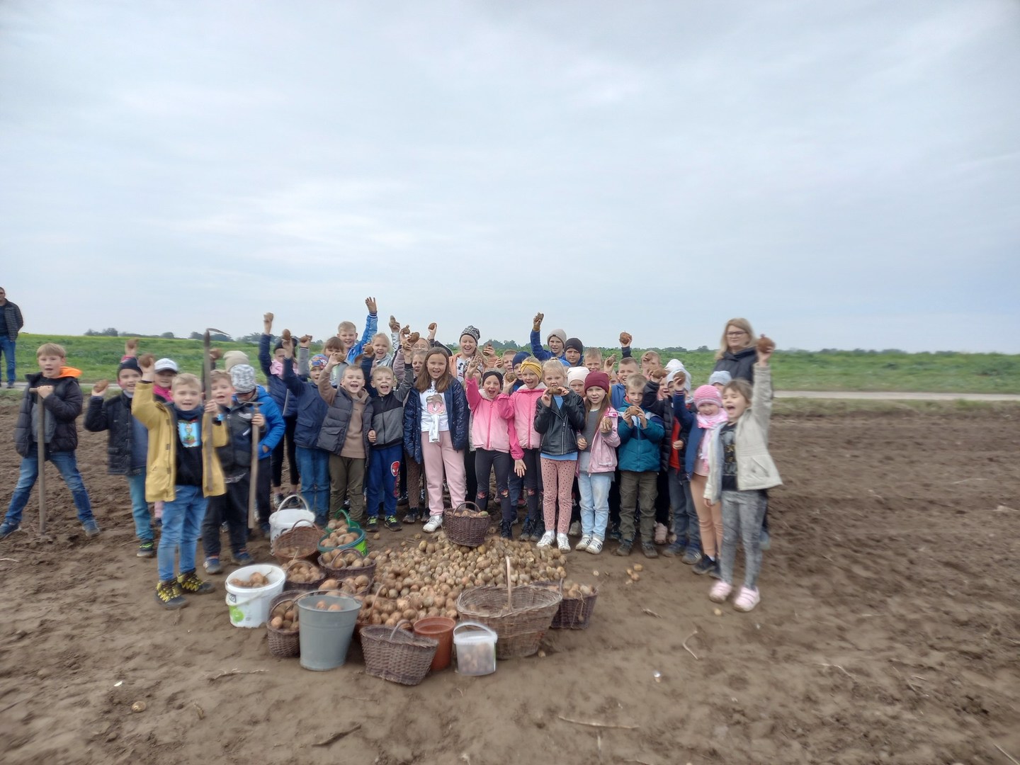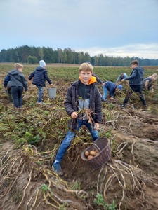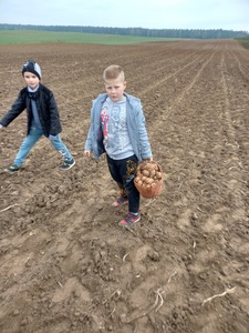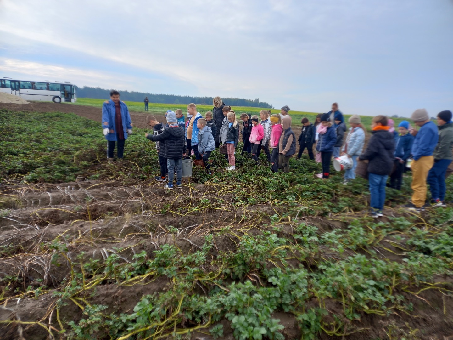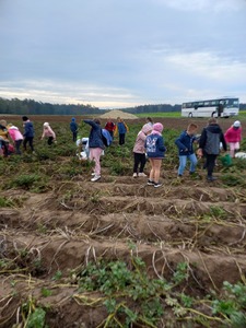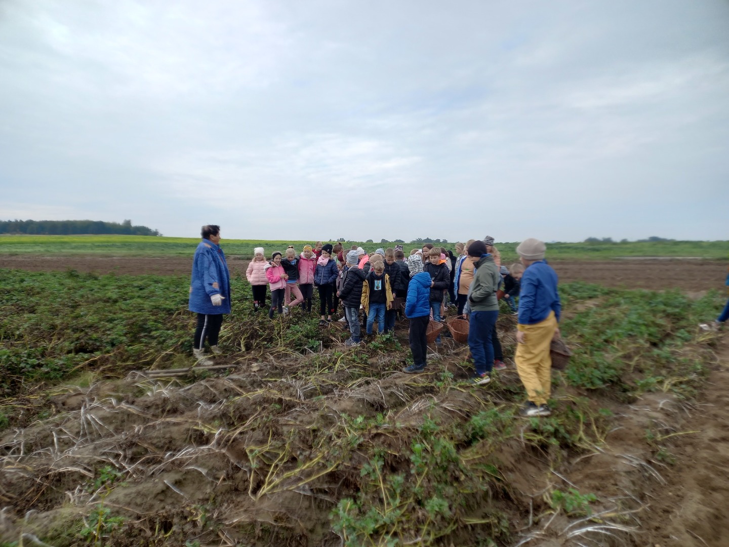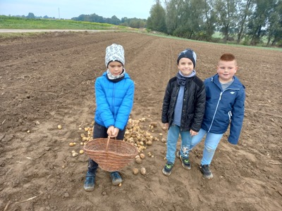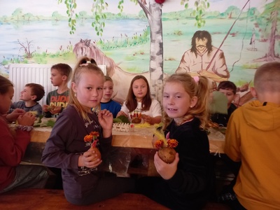 W słoneczny piątkowy poranek wybralismy się na wycieczkę do Gąsawy, aby świętować Dzień Pieczonego Ziemniaka. Uczestniczyliśmy w prawdziwych wykopkach i uzbieraliśmy pełne koszyki ziemniaczanych skarbów, z których później w części warsztatowej robiliśmy nasze Ziemniaki-Cudaki. Wyrabialiśmy własnoręcznie ciasto na pyszne bułeczki, karmiliśmy zwierzęta i jedliśmy tradycyjną wielkopolską pyrę z gzikiem. Znaleźliśmy również czas na ruch na świeżym powietrzu. Dobrą zabawę połączyliśmy z lekcją w terenie na temat roślin okopowych i budowy jej przedstawiciela - ziemniaka. To był dobrze wykorzystany czas !!!