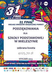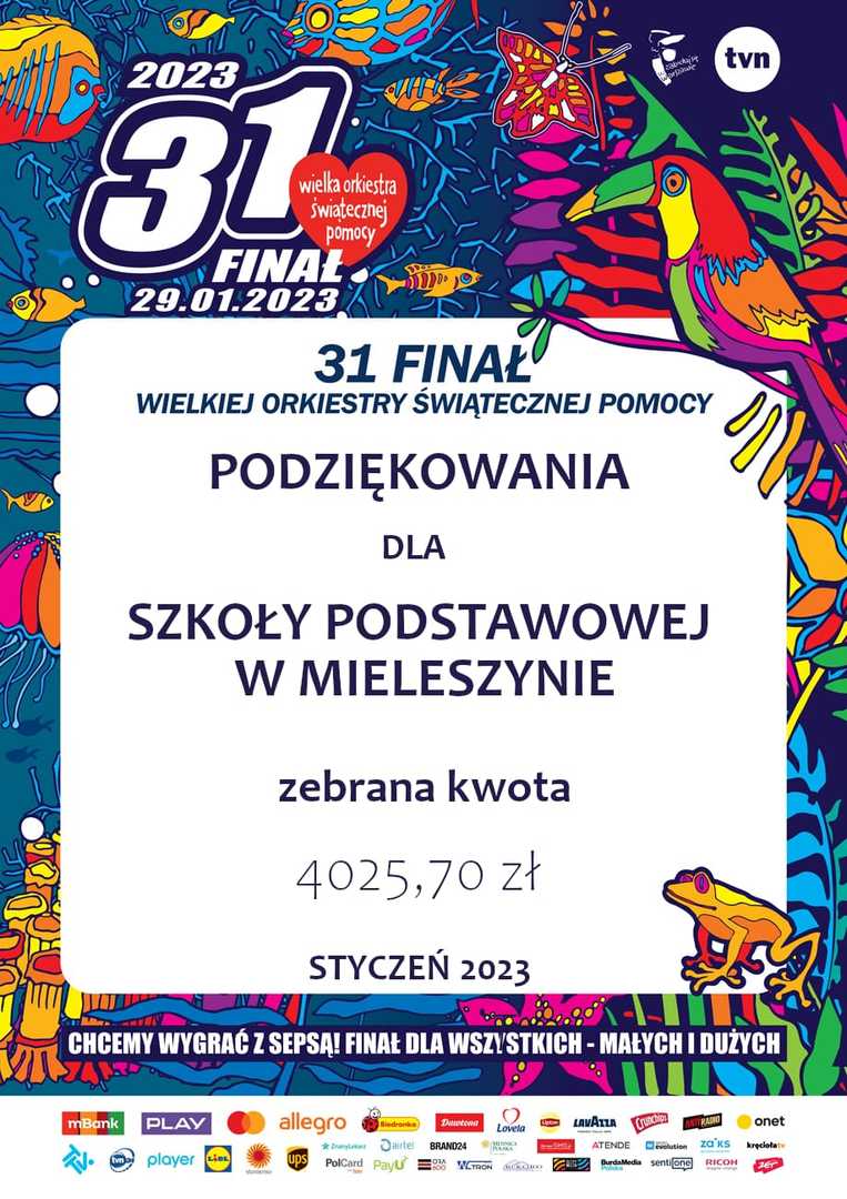 Po raz kolejny włączyliśmy się całą społecznością szkolną w akcje WOŚP. Zorganizowaliśmy szereg i inicjatyw, aby wesprzeć ten szczytny i ważny cel. Nasi artyści narysowali piękne prace, które można było wylicytować podczas dyskoteki szkolnej, nasze mamy upiekły ciasta i słodkości, była wata cukrowa, popcorn i loteria fantowa. Egzamin z pomagania nasza szkoła zdała na szóstkę. Udało nam się zgromadzić ogromną kwotę 4025,70 zł. Pięknie dziękujemy wszystkim, którzy grali z nami :)