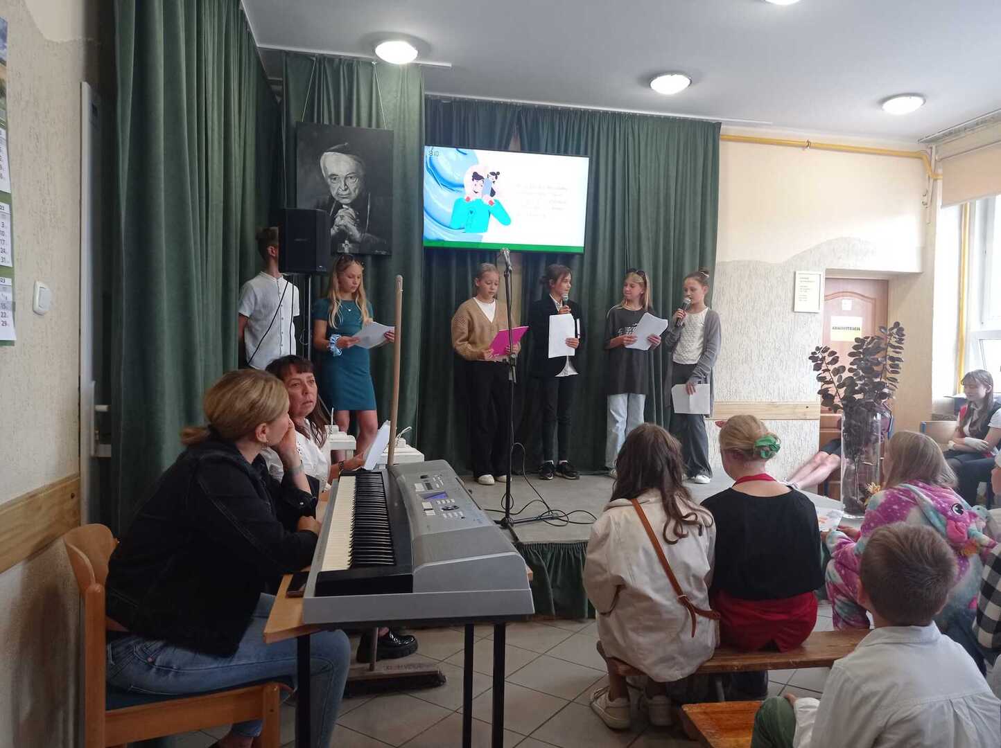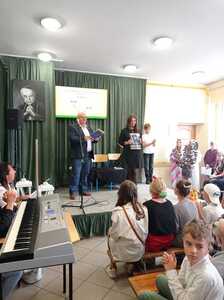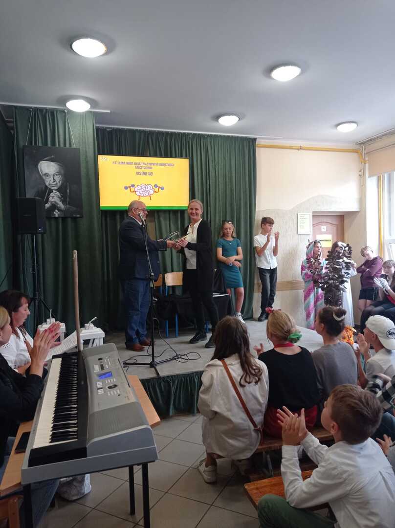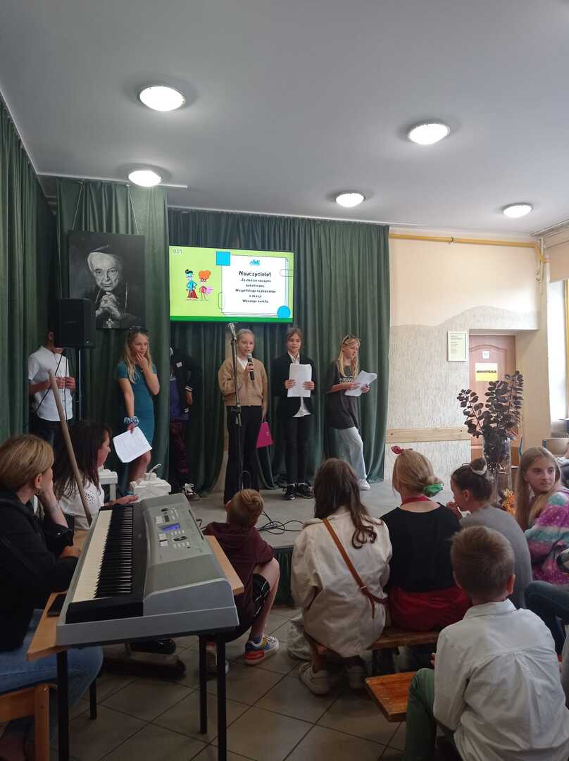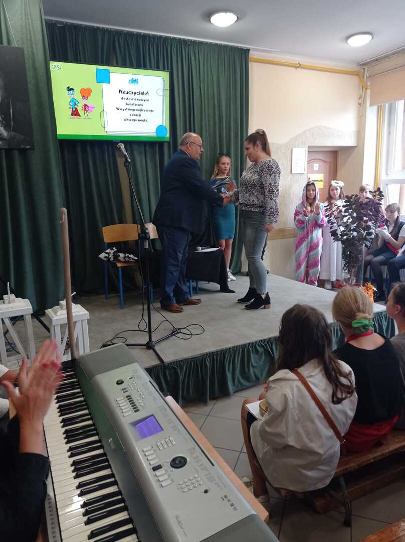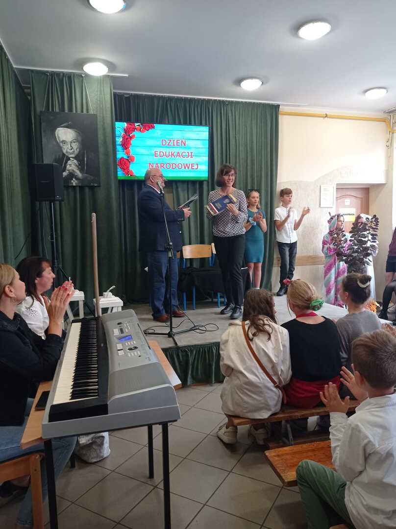 Zbliżający się Dzień Edukacji Narodowej to wspaniała okazja do świętowania. Uczniowie klasy piątej z panią Hanna Nowak przygotowali z tej okazji humorystyczną scenkę o szkolnym życiu. Oczywiście wszystko z przymrożeniem oka Pan dyrektor nagrodził również pracowników szkoły i złożył wszystkim serdeczne życzenia
