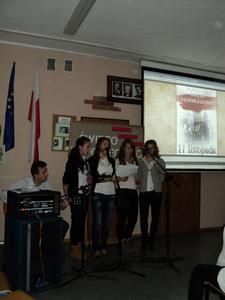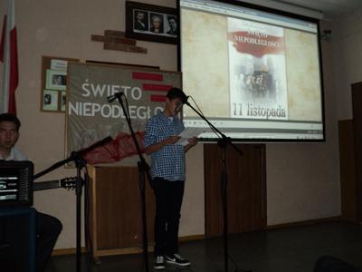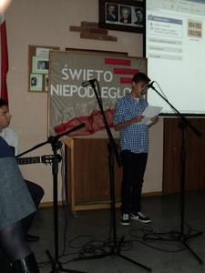 Gimnazjum im. Noblistów Polskich uczciło Święto Niepodległości w piątek, 8 listopada. Apel rozpoczął się uroczystym hymnem oraz przemową wychowawczyni klasy 3a. Następnie, w formie prezentacji multimedialnej, przedstawiona została sytuacja Państwa Polskiego przed odzyskaniem Niepodległości. Przeplatana była ona pieśniami patriotycznymi przygotowanymi przez uczennice klasy 3a przy wsparciu nauczyciela muzyki. Uroczystość zakończyła się odśpiewaniem hymnu szkolnego.