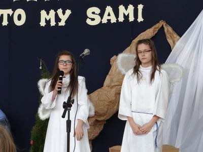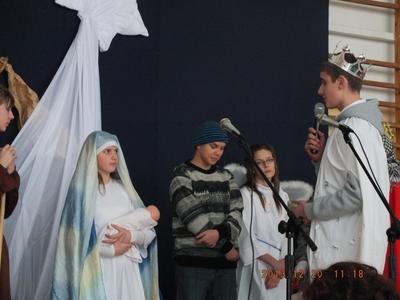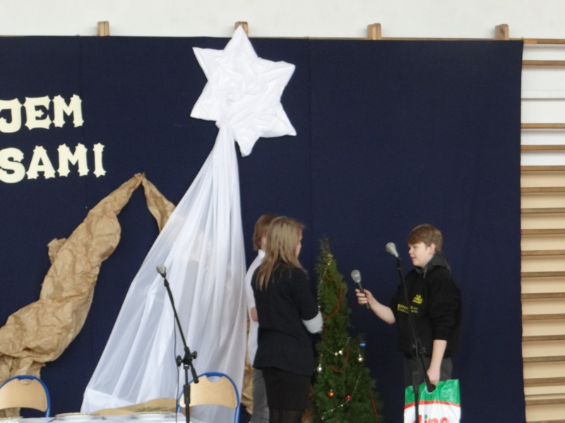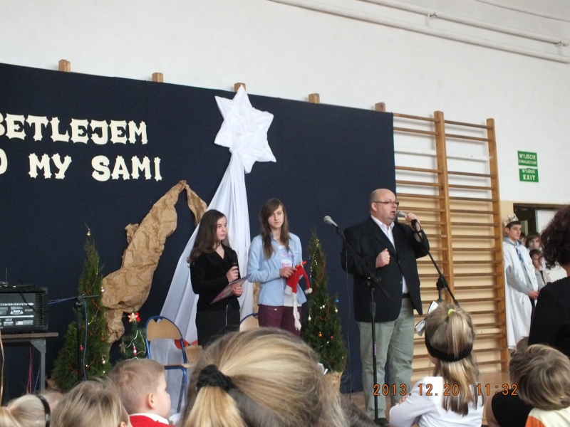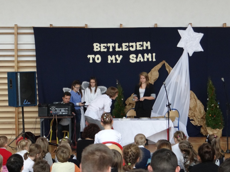 Dyrektorzy Gimnazjum oraz Szkoły Podstawowej serdecznie przywitali uczniów i złożyli piękne, szczere życzenia świąteczne. Następnie klasa 1a wystąpiła z przedstawieniem o tematyce religijnej i świątecznej. Program artystyczny przygotowała pani Małgorzata Kasperska, a muzyką zajął się tradycyjnie pan Jarosław Zieliński. Kolędy zaśpiewały dla nas: Daria Koczorowska, Daria Brzeźniak, Monika Kleinke, Weronika Kamyszek i Weronika Wasela. Dziewczęta pięknym wykonem porwały całą publiczność do śpiewania. Wszyscy świetnie się bawili i z pewnością każdy poczuł magię zbliżających się świąt. Po przedstawieniu artystów obdarowano gromkimi oklaskami.