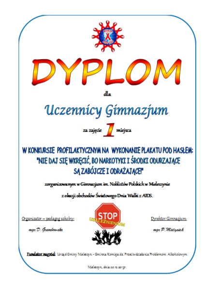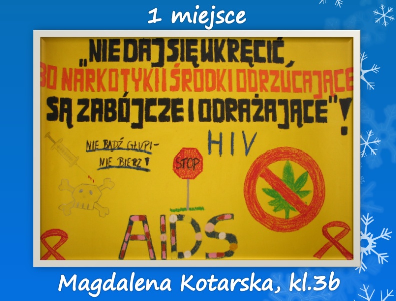 W związku z obchodzonym 1 grudnia Światowym Dniem AIDS zorganizowany został przez szkolnego pedagoga – panią Danutę Grembowską, KONKURS PROFILAKTYCZNY NA WYKONANIE PLAKATU I ULOTKI INFORMACYJNEJ pod hasłem: „NIE DAJ SIĘ WKRĘCIĆ, BO NARKOTYKI I ŚRODKI ODURZAJĄCE SĄ ZABÓJCZE I ODRAŻAJĄCE!”
